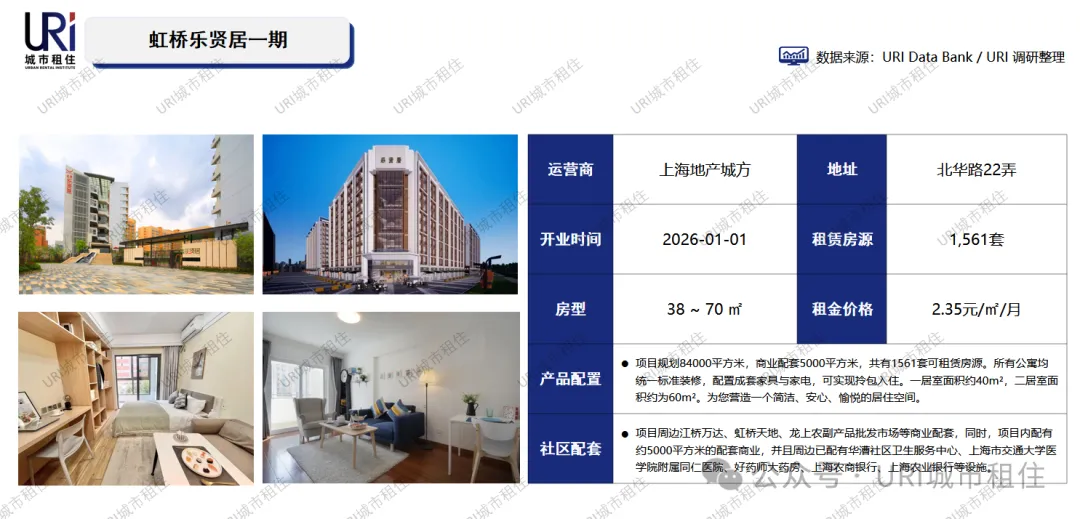 虹桥乐贤居(一期)位于上海市闵行区北华路,是上海地产集团旗下的人才公寓品牌项目,也是虹桥商务区重点打造的租赁住房。一期为市筹公共租赁住房,总建筑面积约8.4万平方米,共有1561套房源,主要面向注册地或办公地在虹桥商务区内的企业出租。