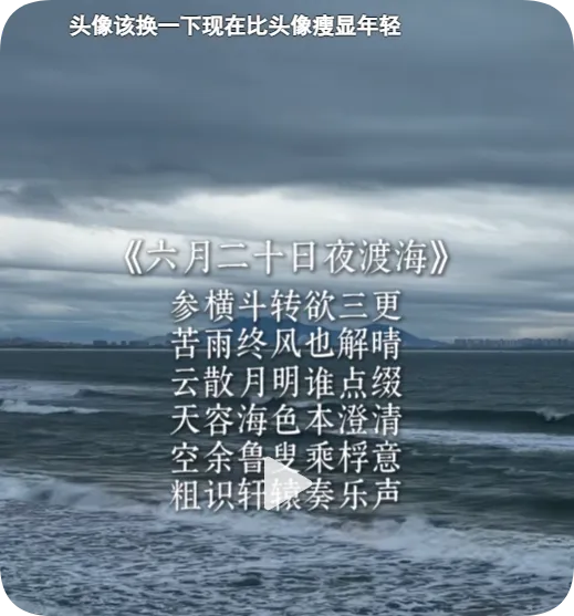 视频里,乘船前往儋州的罗振宇开始背起了《六月二十日夜渡海》。只不过,此时画面切到了大海翻波的空镜头,所以我觉得,罗胖或许其实是背不完这首诗的……
