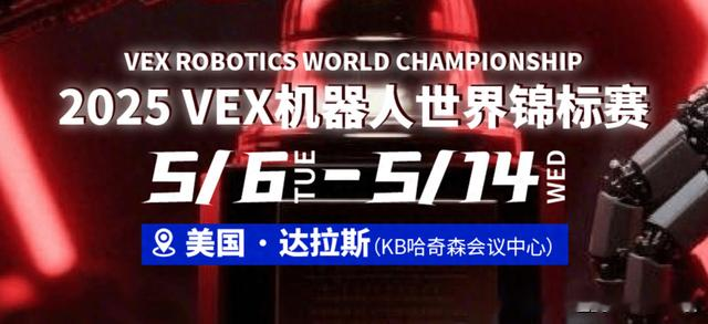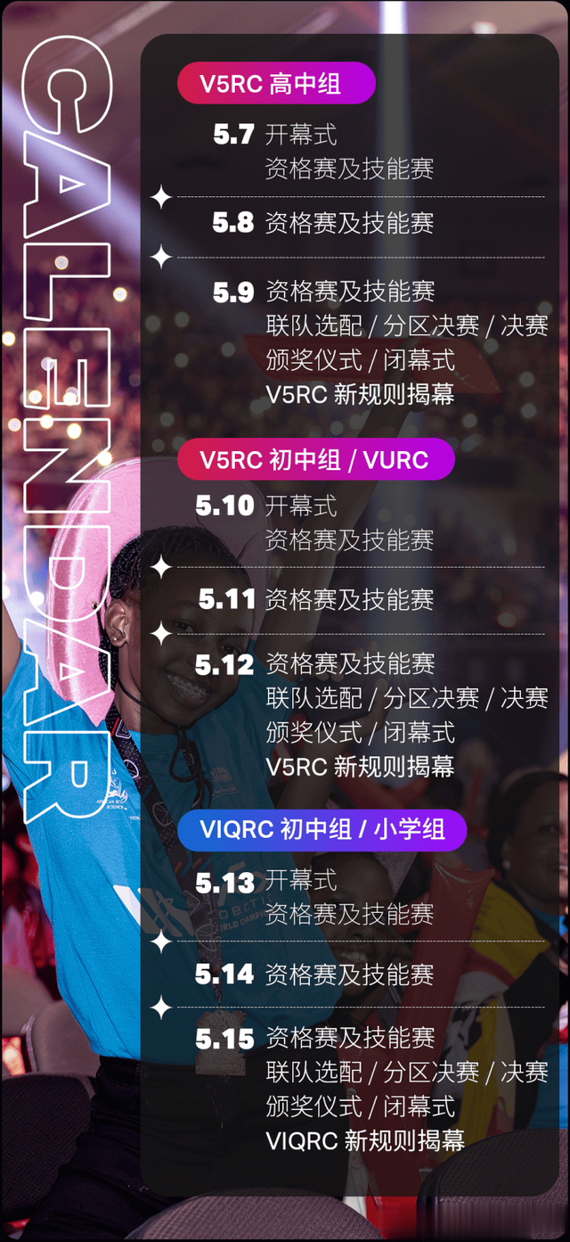 5月6日-8日:VEX V5机器人竞赛-高中组。5月9日-11日:VEX V5机器人竞赛-初中组、VEX V5机器人竞赛-JROTC组、VEX U机器人竞赛-大学组。5月12日-14日:VEX IQ机器人竞赛-小学组、VEX IQ机器人竞赛-初中组。美国与中国相差13个小时