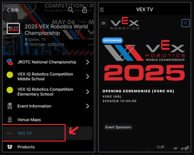 赛事期间还可以通过VEX Worlds观看网络直播。下载VEX Worlds,打开软件找到VEX TV入口,实时观看开幕式、分区赛、总决赛、闭幕式等。