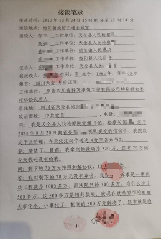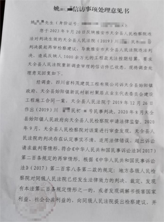姚康清表示,一审判决作出时,其曾认为权益维护出现转机,甚至已着手规划偿还欠款,但未料后续事态转变。2020年,始阳镇相关行政部门在未提起上诉,亦未依法向法院申请再审的情况下,向天全县检察院提出申诉。天全县检察院受理该申诉后,出具了再审检察建议,法院据此撤销原一审判决,改判由已解散的新村业委会承担320万余元工程款支付责任。