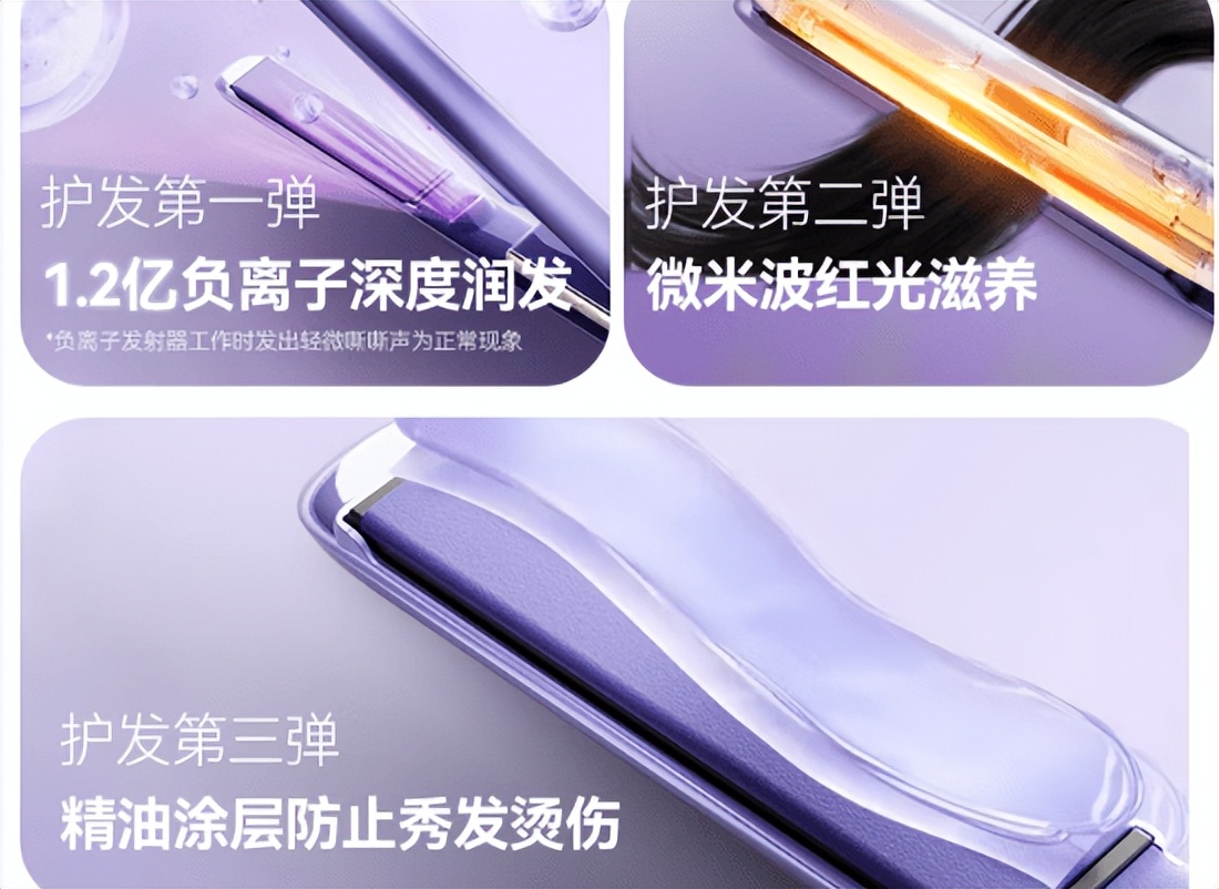 三重防烫设计是它的一大安全亮点,高温夹板区域被妥善包裹,手握部位几乎不会发热。这不仅让新手能放心上手操作,不用担心不小心烫伤手;对于家里有小孩的家庭,也能降低孩子误触受伤的风险,操作时握持手感舒适,造型过程更顺畅。1.2亿负离子搭配微米波红光技术的组合,能针对性解决美发后头发毛躁、干枯的常见问题。负离子可中和发丝静电,减少毛躁分叉,微米波红光则能辅助滋养发丝,让造型后的头发依旧保持光泽顺滑,长期使用也不易损伤发质。