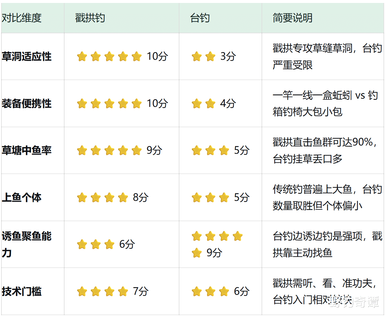 这话问得好。我先给你看张表,对比一下两种钓法在野钓草塘里的表现: