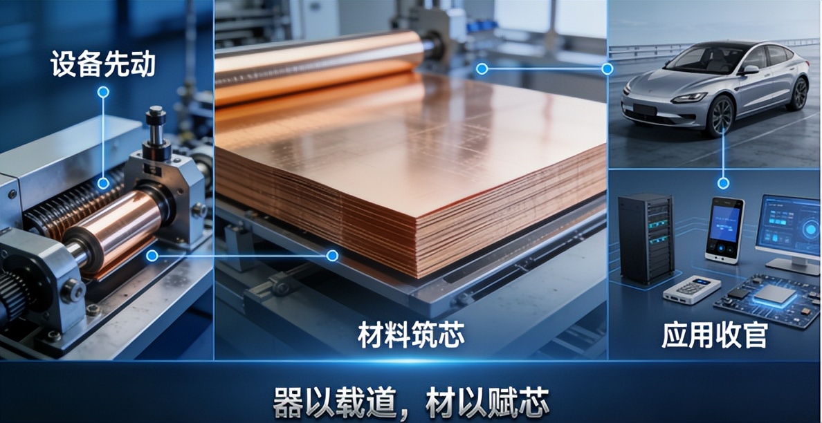 “设备先动,材料筑芯,应用收官”的接力逻辑,从来不是一套生硬的产业公式,而是锂电铜箔产业结构的真实投影,它映射着一条清晰的产业路径:技术预期→产能建设→价值兑现,更蕴含着“器以载道,材以赋芯”的底层哲思——设备作为产业之“器”,承载着技术落地的产业之道,让高端材料的量产从设想变为现实;材料作为产业之“芯”,赋予着各赛道高端化发展的核心内核,支撑新能源、5G、AI等领域的技术突破;而应用作为产业之“果”,则是器与芯的最终归真,让技术与产品的价值在市场中得以兑现。