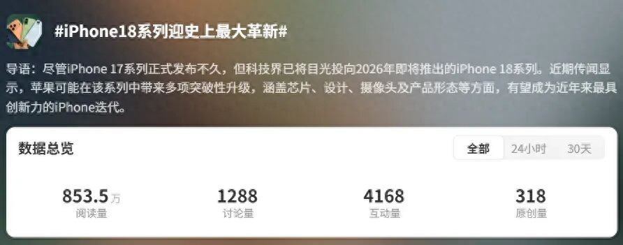 今日,一则“iPhone 18系列迎史上最大革新”的词条登上热搜。