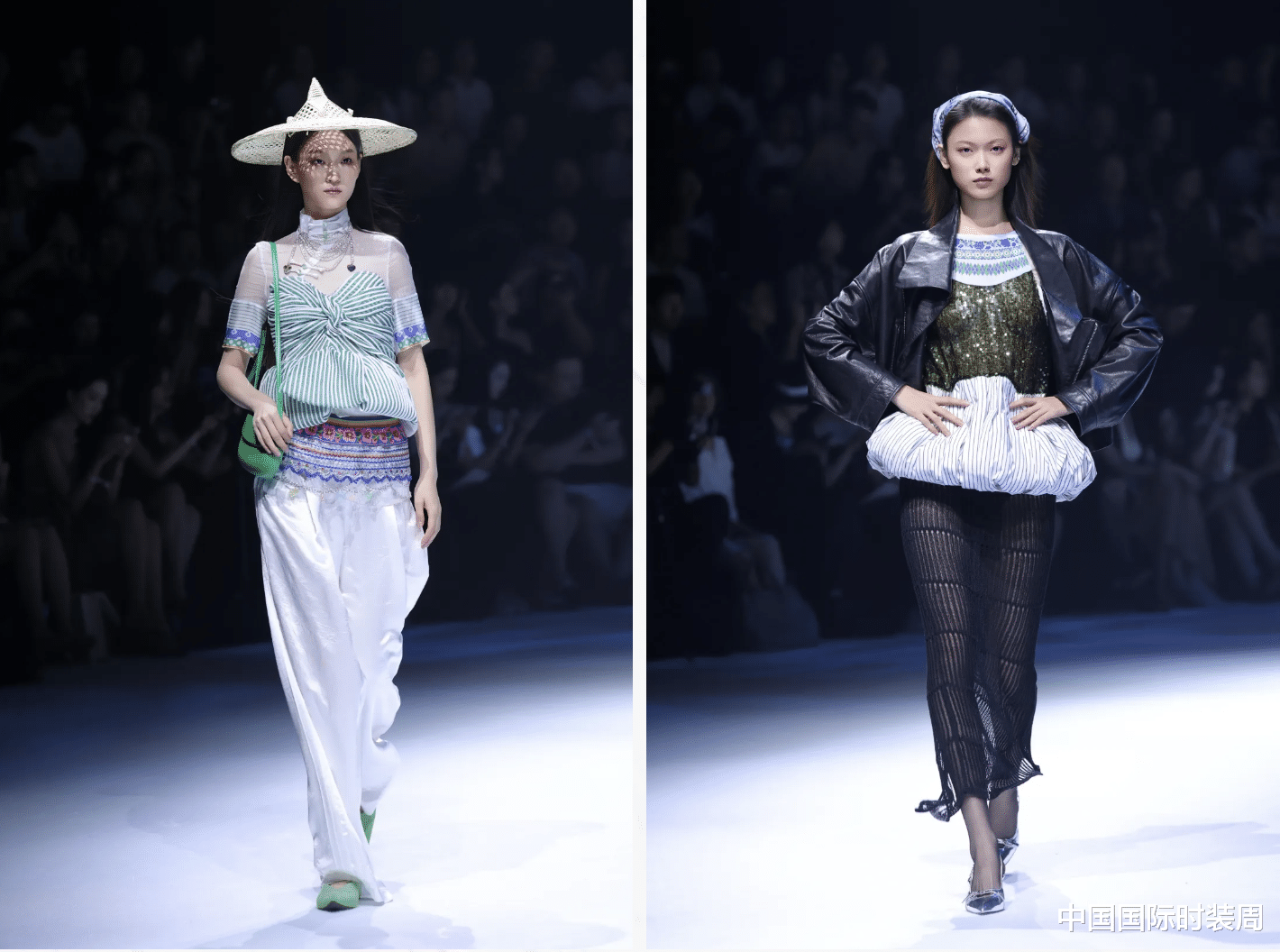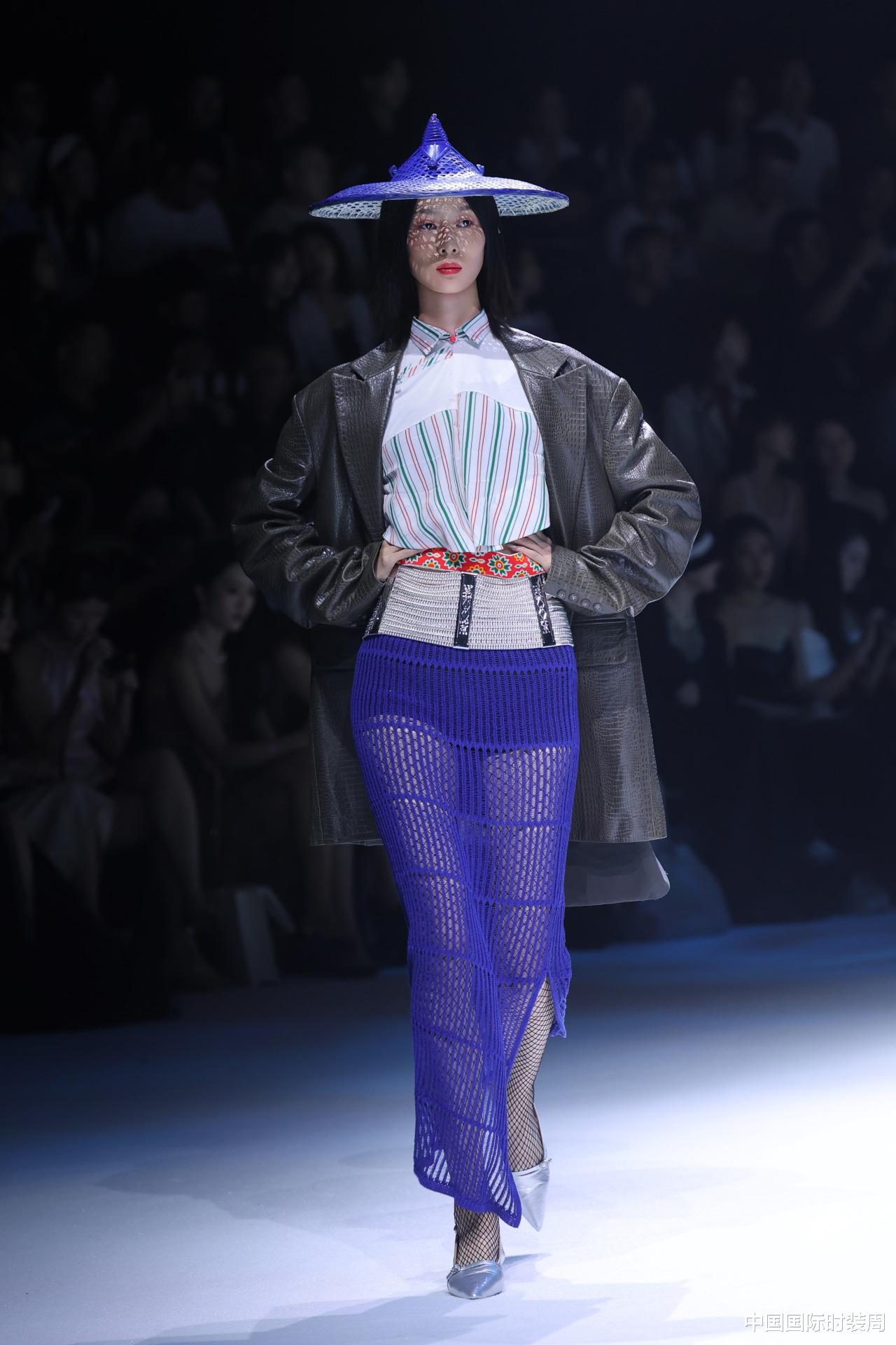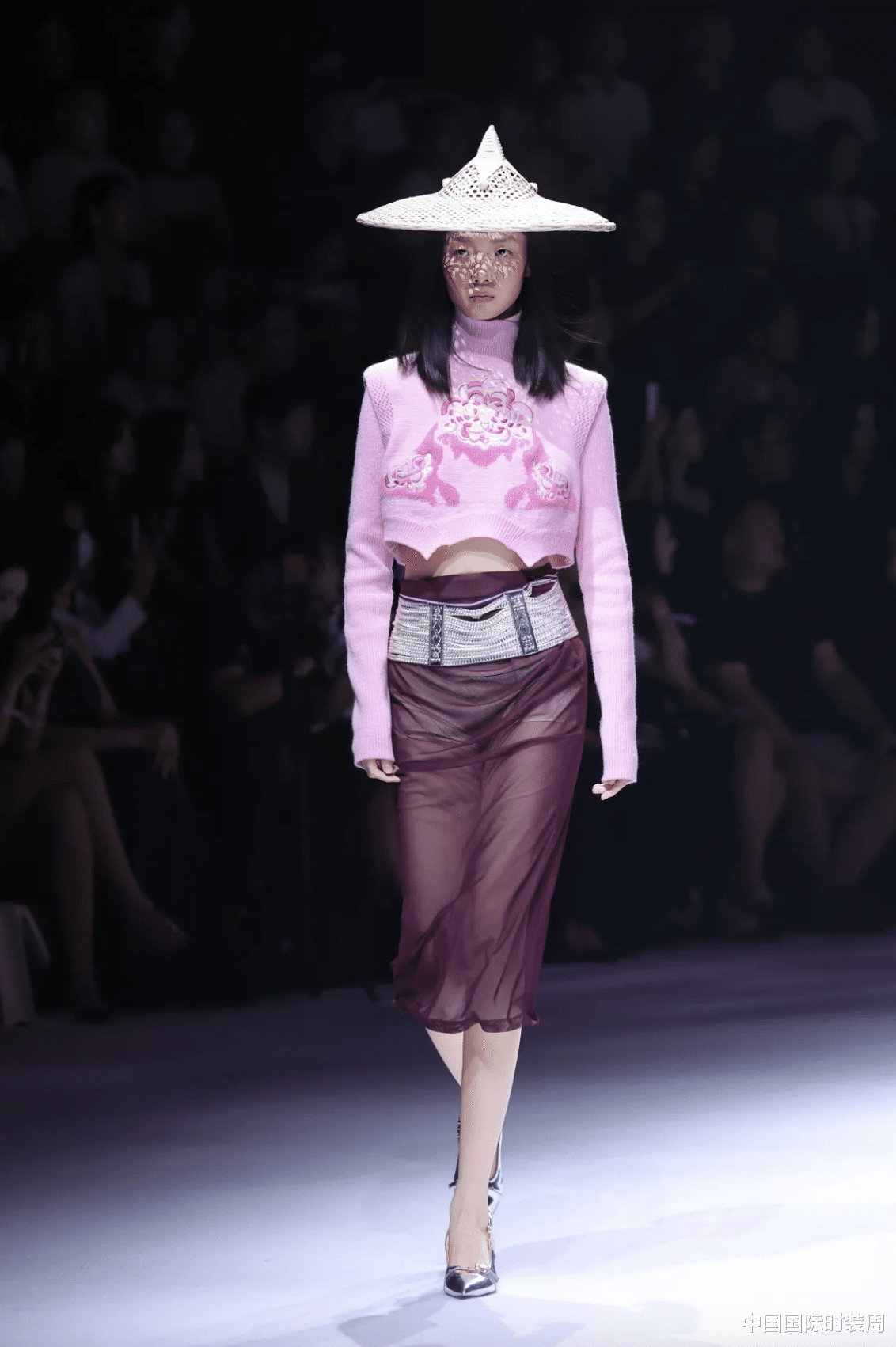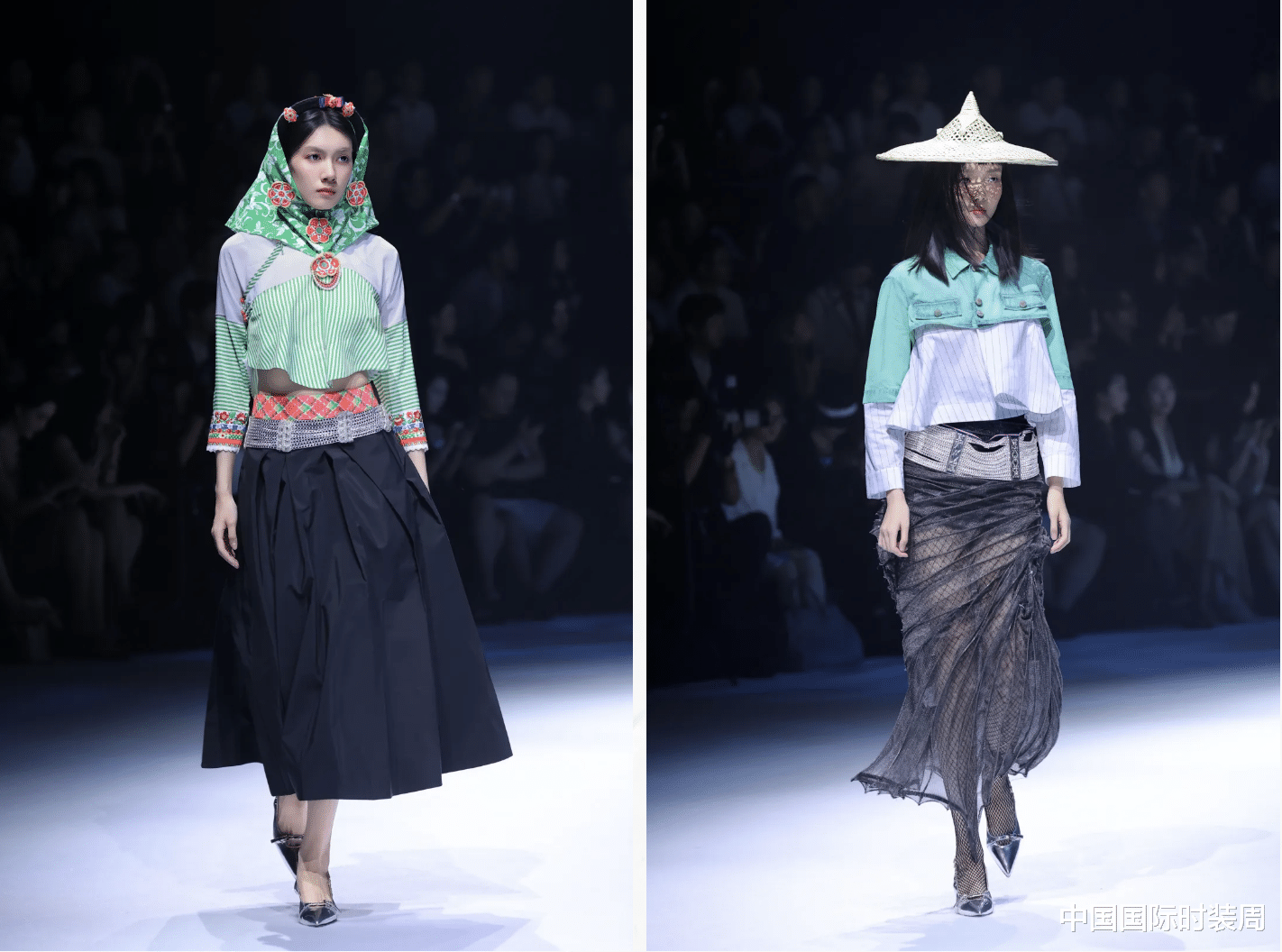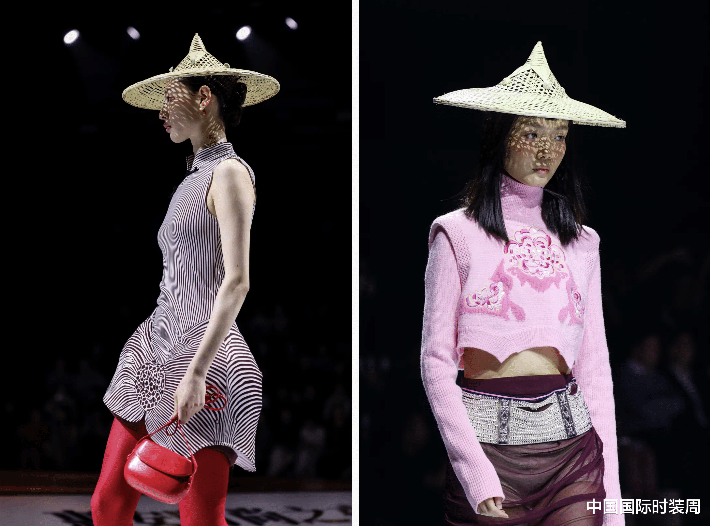 在沉浸式光影与多媒体叙事氛围中,模特们身着以惠安女传统服饰为原型重新解构的设计作品缓步而来——黄斗笠轻垂薄纱,呼应现代廓形;花头巾化作印花元素,点缀于飘逸缎面;短上衣与宽筒裤通过立体剪裁与不对称设计,兼顾视觉张力与动态美感;银腰带则以当代金属饰件的形式重现,勾勒出柔中带刚的女性线条。