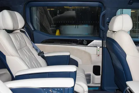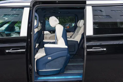 其车身尺寸长5217mm带来轴距3205mm, 这尺寸超越了同级别车型。迈步踏入车厢的那一刻,我仿佛不是进入一辆车,而是走进了一个融合科技、奢华与人文关怀的移动生活空间。触手可及的材质大面积采用NAPPA真皮包裹的座椅、门饰板与扶手,搭配天然实木镶嵌的中控饰条,每一寸都散发着低调却不容忽视的G级感。从打开电动侧滑门的那一刻起,仪式感便扑面而来。身高1.92米的我随便坐进前排,头离车顶有两拳半的距离,腿部活动范围也有三拳半左右,大长腿可以在车里任意摆放。中排双独立航空座椅宽敞得令人惊叹,特别是“七座过道版”的中央通道设计。不同于传统MPV将第三排藏在“角落”的局促感,这条贯穿二、三排的中央走廊让进出第三排变得从容优雅,无需费力翻越或挪动座椅,老人小孩上下车都轻松自如,真正实现了“人人都是 VIP”。