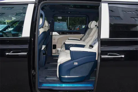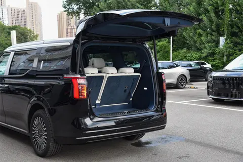 车身侧面是这台车打动我的部分。修长的车体线条流畅,腰线从车头一直延伸至尾灯,勾勒出从容不迫的商务气质。但真正让人眼前一亮的是那扇电动侧滑门,不仅开启安静顺滑,而且轨道内嵌设计让整体侧面更显整洁。作为七座过道版,它的中排独立座椅之间留出了宽敞的中央通道,从外部看,车身比例依旧协调。
