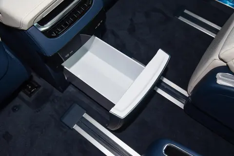 储物空间方面也考虑周到:门板储物格够深,前排中央扶手箱和前后排杯架布局合理,甚至在B柱上方还设置了专门放置眼镜的小暗格。后备箱在七座满员状态下容积为574L,仍能放下三个登机箱外加几个随身包,若放倒第三排,空间更是迅速扩大2963L,形成一个近乎平整的“移动客厅”,露营装备、婴儿车、滑雪板都不在话下。