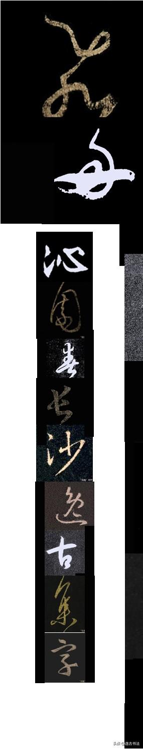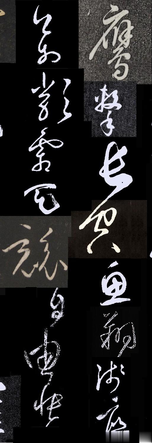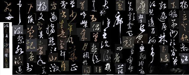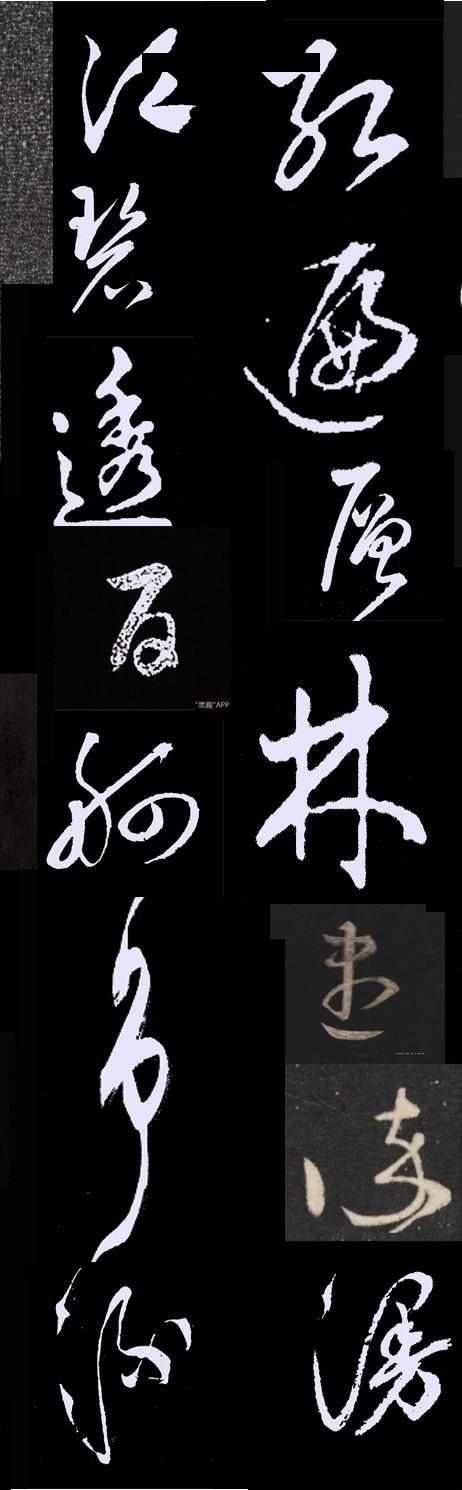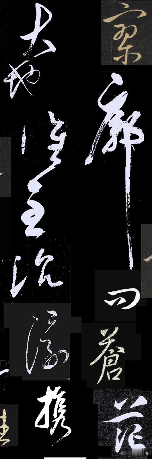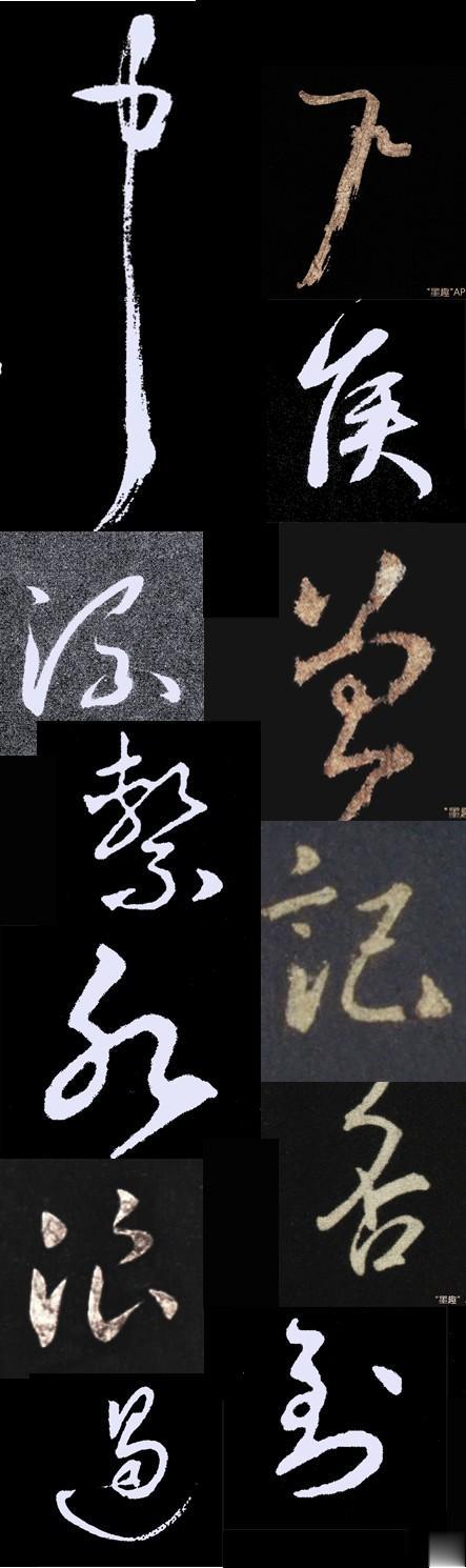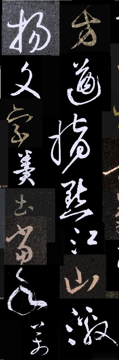 寥廓(唐米芾),问苍茫(唐孙过庭)大(唐张旭)地(宋宋徽宗),谁(唐孙过庭)主(明祝允明)沉(唐怀素)浮(北宋黄庭坚)?携(明董其昌)