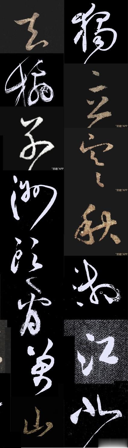 独(元鲜于枢)立寒秋,湘(唐张旭)江(北宋米芾)北(唐张旭)去,橘(明文征明)子洲(明王铎)头(明韩道亨)。