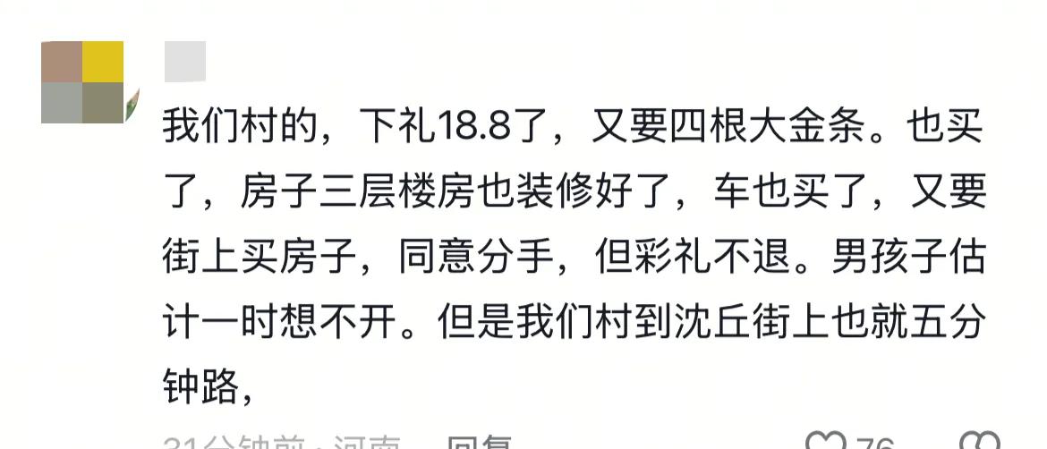 男方家有三层楼房也装修好了,车子也买了,女方这边要求彩礼18.8万,加上五金差不多25万左右。