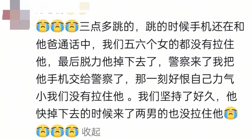 目击者发声,据说当时小伙子还跟父亲通电话,周围五六个人的一起拉他,但是他拼死挣脱,最终他手机给了路人,选择跳下去。