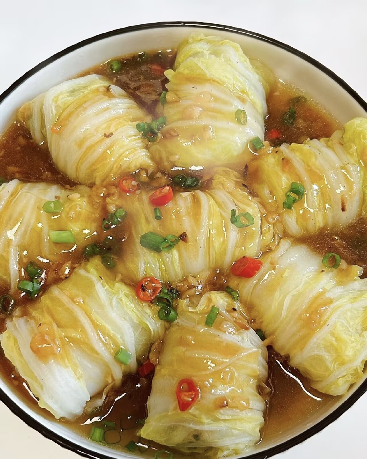最后一步是勾芡汁,这是点睛之笔。蒸白菜卷的盘子里会留下很多汤汁,特别鲜,别倒掉。把这汤汁倒进锅里,加一小勺生抽,烧开后用水淀粉勾个薄芡,淋在白菜卷上。芡汁要亮晶晶的,像给白菜卷穿了件透明雨衣。撒上点葱花或者红椒丁,颜色一下就跳出来了。
