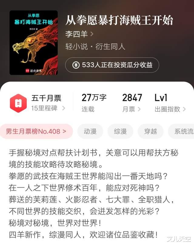 究其原因,感觉还是开局所用的拳愿阿修罗的武技修行作为在海贼里的金手指还是有关的,毕竟拳愿同人元素在网文里很小众的。