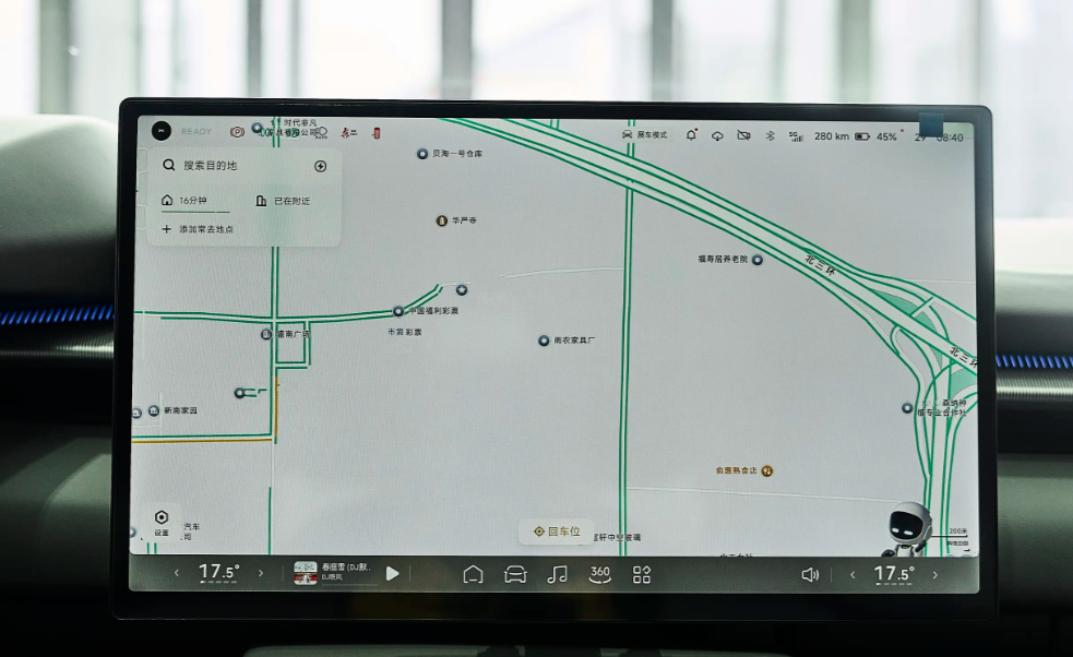 层次分明的中控台和中央岛台没什么好说的,都是当前比较常见的设计风格,最具特色的元素便是在驾驶位正前方的显示屏被集成在一块凸起的面板,车内搭载小鹏G7同款87英寸AR-HUD,这项功能的产品亮点实在太多太多,对此可以先参考一下小鹏G7,驾驶位正前方的中控台上形成了一个很大的深坑,HUD系统配合这块屏幕向驾驶员展示丰富行车信息。