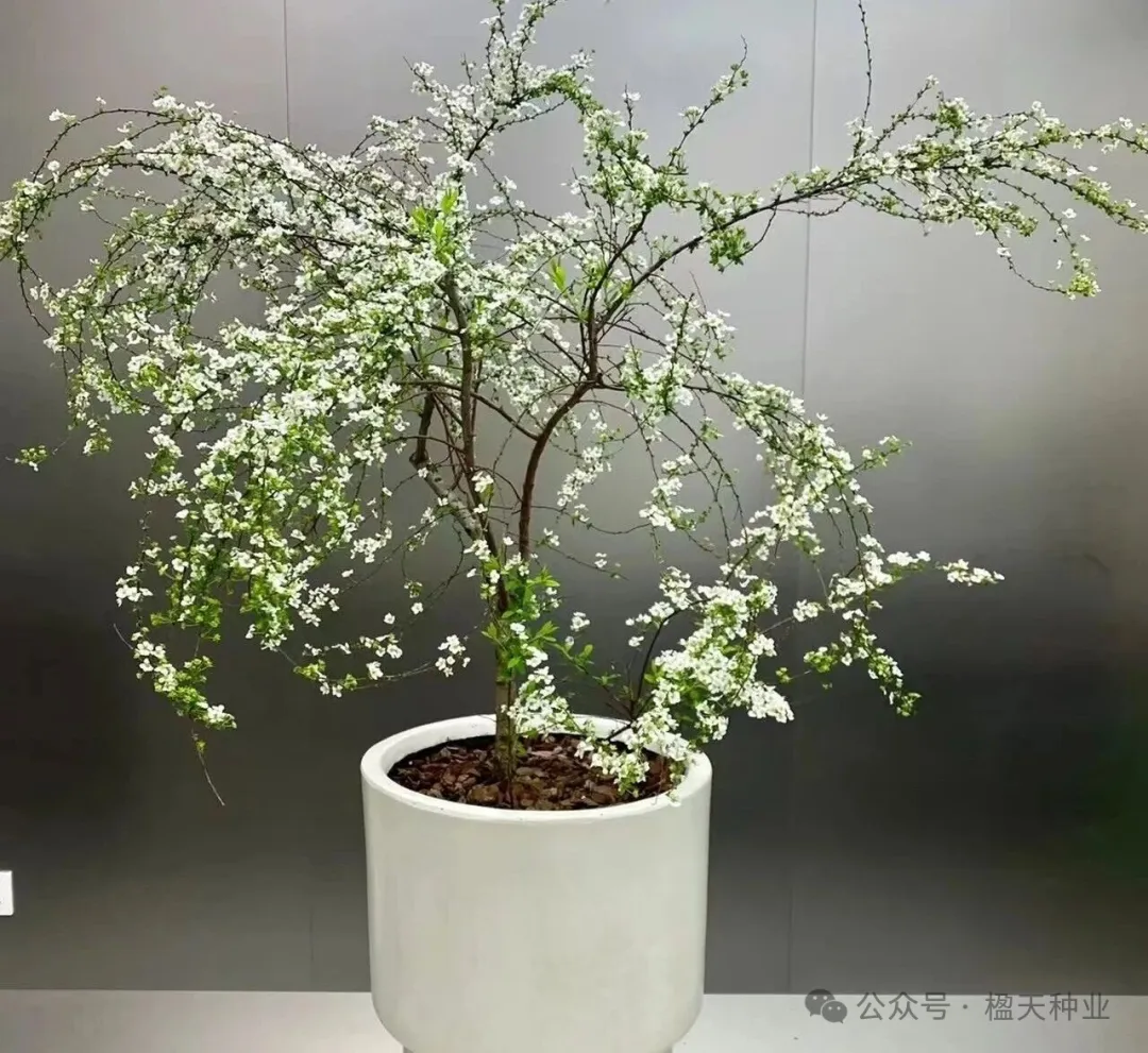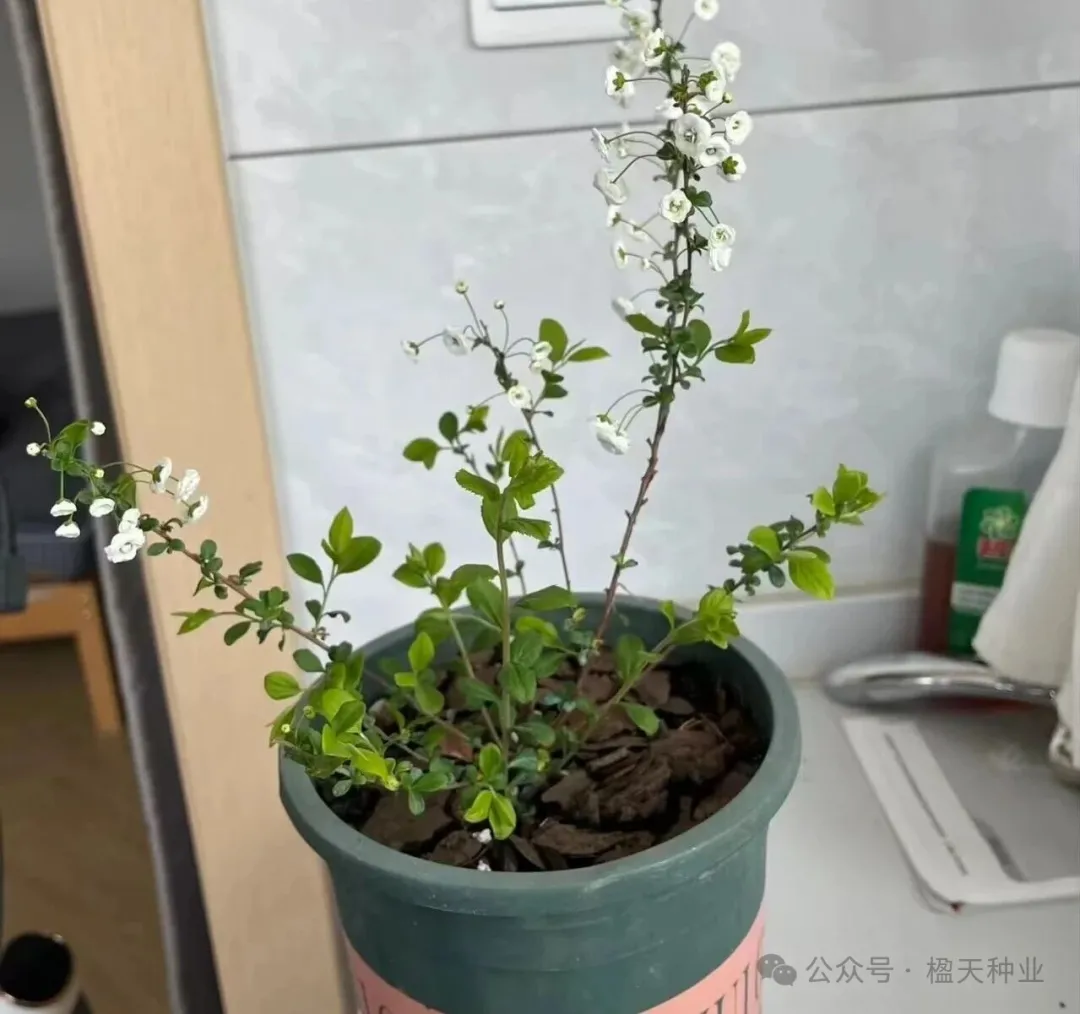 2.盆栽苗(长期养护)缓苗:收到后不要立即换盆,放在散光处缓苗2-3天,避免阳光直射;换盆:缓苗后用“腐叶土4:园土3:粗河沙3混合配土,选直径20cm以上的陶盆,盆底铺陶粒防积水,带土球移栽(别抖散原土,避免伤根);修剪:剪掉干枯、病弱枝条,保留健康枝条,促进分枝发芽。三、极简养护:抓3个核心,开花不难1.光照:喜光但怕暴晒鲜切枝:放在室内散光处(每天2-3小时光照),避开空调、暖气出风口(防止脱水);盆栽苗:春秋冬可全日照养护,夏季高温时遮阴(避免叶片灼伤),光照不足会导致开花少。2.浇水:见干见湿,忌积水鲜切枝:3天换一次水,保持水质干净,水位下降及时补充;盆栽苗:遵循“土干2cm再浇透”,春秋生长季每周浇1次,夏季2-3天浇1次,冬季减少浇水(盆土微湿即可),积水容易烂根。3.施肥+花期管理盆栽苗:春季发芽后,每15天施1次薄肥(花多多1号),现蕾后改施磷酸二氢钾(1:1000稀释),促进开花;花期:雪柳自然花期2-4月,鲜切枝插瓶后1-2周发芽开花,花期持续1个月左右;盆栽花谢后剪掉残花,保留枝条,来年还能开花。4.冬季养护:保暖防冻鲜切枝:冬季室内温度保持5℃以上,就能正常发芽开花;盆栽苗:北方冬季移到室内(温度≥0℃),避免冻伤枝条,停止施肥,控制浇水。