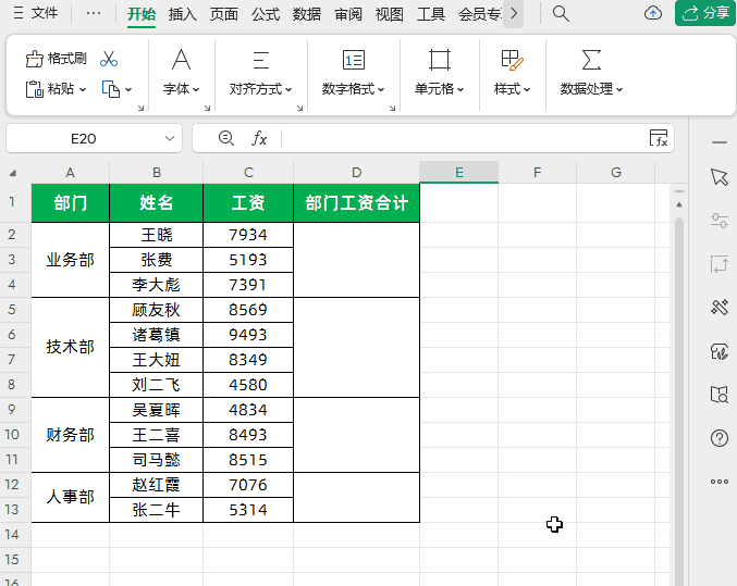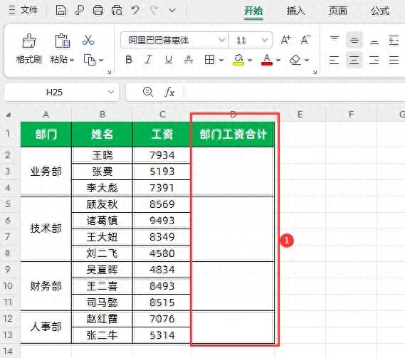 第一步:首先全选所有合并的“部门工资合计”单元格区域,如下图所示