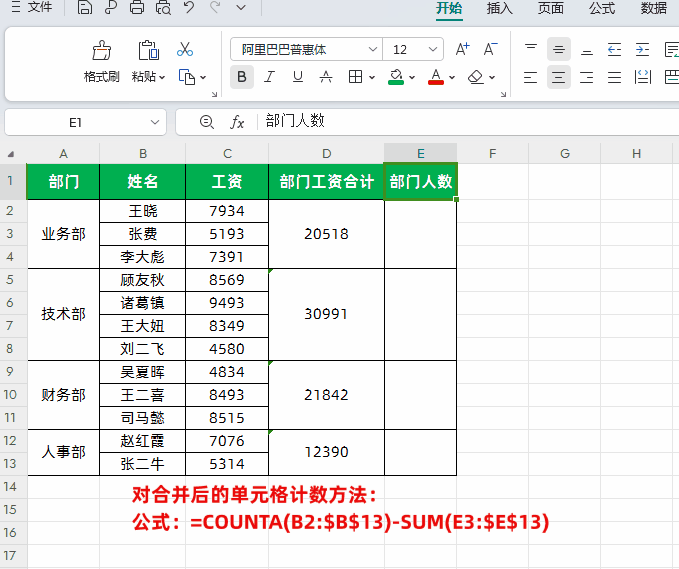=COUNTA(原始数据区域非空的单元格)-SUM(结果输出区域的偏移区域)同样我们以下图“员工工资信息表”为例,我们需要按照部门统计计数员工总数,其实会了合并单元格求和,那就会计数,直接把第1个SUM函数公式换成COUNTA函数公式具体操作如下: