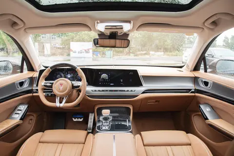 咱们先看入门版,2.0T旗享版,限时售价23.42万,车身尺寸方面,车长5137mm,宽1904mm,高1498mm,轴距3060mm,定位中大型轿车,使用2.0T涡轮增压发动机+48V轻混系统,匹配8AT变速箱,最大马力252匹,峰值扭矩380Nm,最高车速230km/小时,百公里加速时间7.8秒,WLTC综合油耗7.05L/百公里,需要加95号汽油,前置后驱,使用前双叉臂+后多连杆式独立悬挂,车外有3颗毫米波雷达,8颗超声波雷达,5颗摄像头,不过并不支持L2辅助驾驶,带有一系列的主动安全配置,配置方面,标配20英寸铝合金轮毂,8安全气囊,电子驻车,疲劳驾驶提醒,胎压显示,360度全景影像,定速巡航,发动机启停,真皮方向盘支持四向电动调节以及记忆功能,双12.3英寸立体双联屏,支持4G车联网,主驾语音识别,12扬声器BOSE音响,后排带有触控屏,电动记忆尾门,前排无钥匙进入,无钥匙启动,支持手机APP远程控制,前排40W手机无线充电,主驾12向副驾6向座椅电动调节,主驾座椅记忆,后排座椅靠背电动调节带有中央扶手,前排座椅通风、加热,全景天窗,织物顶棚,双层隔音玻璃,后排隐私玻璃,外后视镜加热、记忆、锁车自动折叠、倒车自动下翻,自动防眩目内后视镜,主副驾化妆镜带有照明灯,矩阵式自动大灯,自适应远近光灯,带有前梦想之翼+后北斗之翼迎宾灯效,全亮旗标灯+侧旗标灯,253色内饰氛围灯,白色足部氛围灯,感应雨刷,四温区自动空调,AQS空气质量管理系统,负离子发生器,PM2.5空调滤芯。