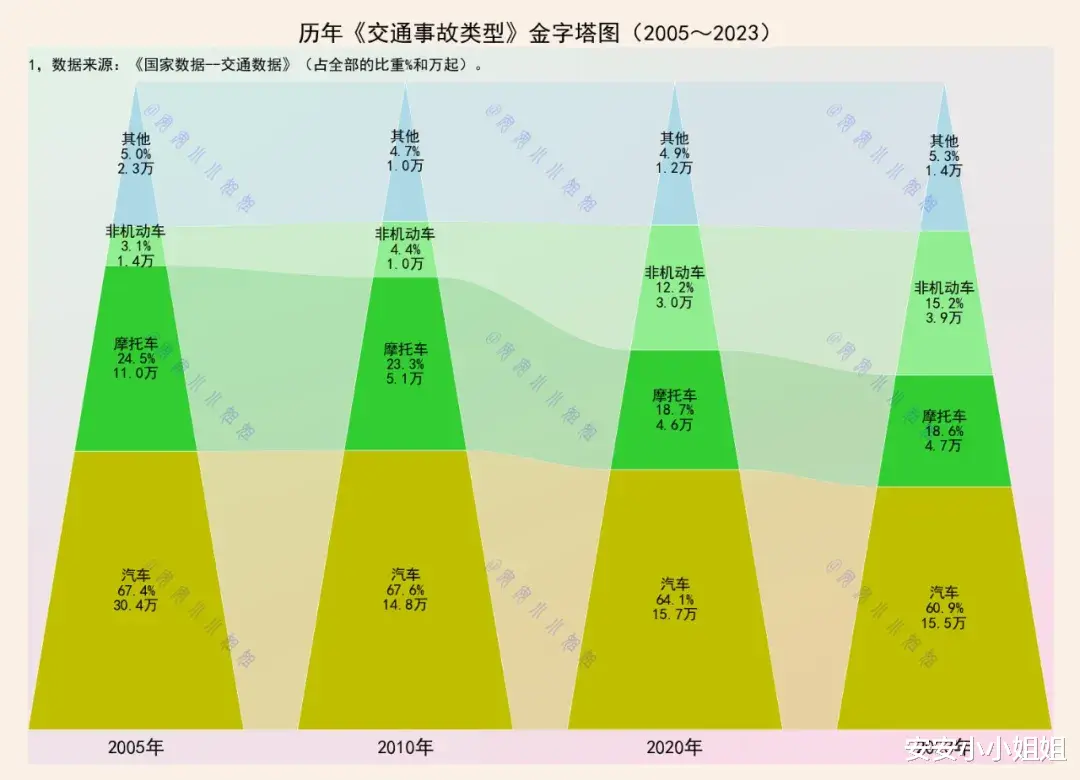 从2005年汽车事故占比67.4%的绝对主导,到2023年汽车、摩托车、非机动车"三足鼎立"的新格局,这些冷冰冰的百分比数字背后,是一场正在发生的道路空间争夺战。