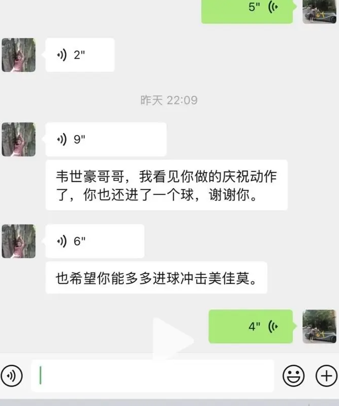 赛后,韦世豪在社交媒体上晒出了他与林子金的聊天记录,并配文写道:“赛前答应你的进球,答应你的打游戏庆祝动作。林子金,希望你早日回到球场。”这条消息迅速引起了球迷们的关注,大家纷纷为韦世豪的暖心举动点赞。林子金也回复了韦世豪,表达了自己的感激之情,并希望韦世豪能够继续进球,帮助国足冲进美加墨世界杯。