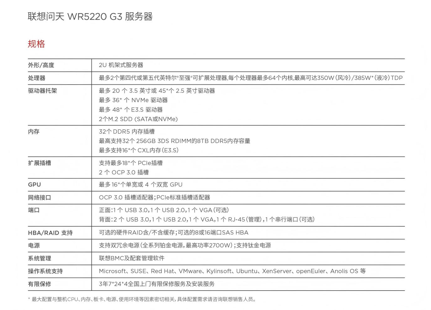 作为一款 2U 双路机架式服务器,WR5220 G3 的核心参数足够「能打」:
