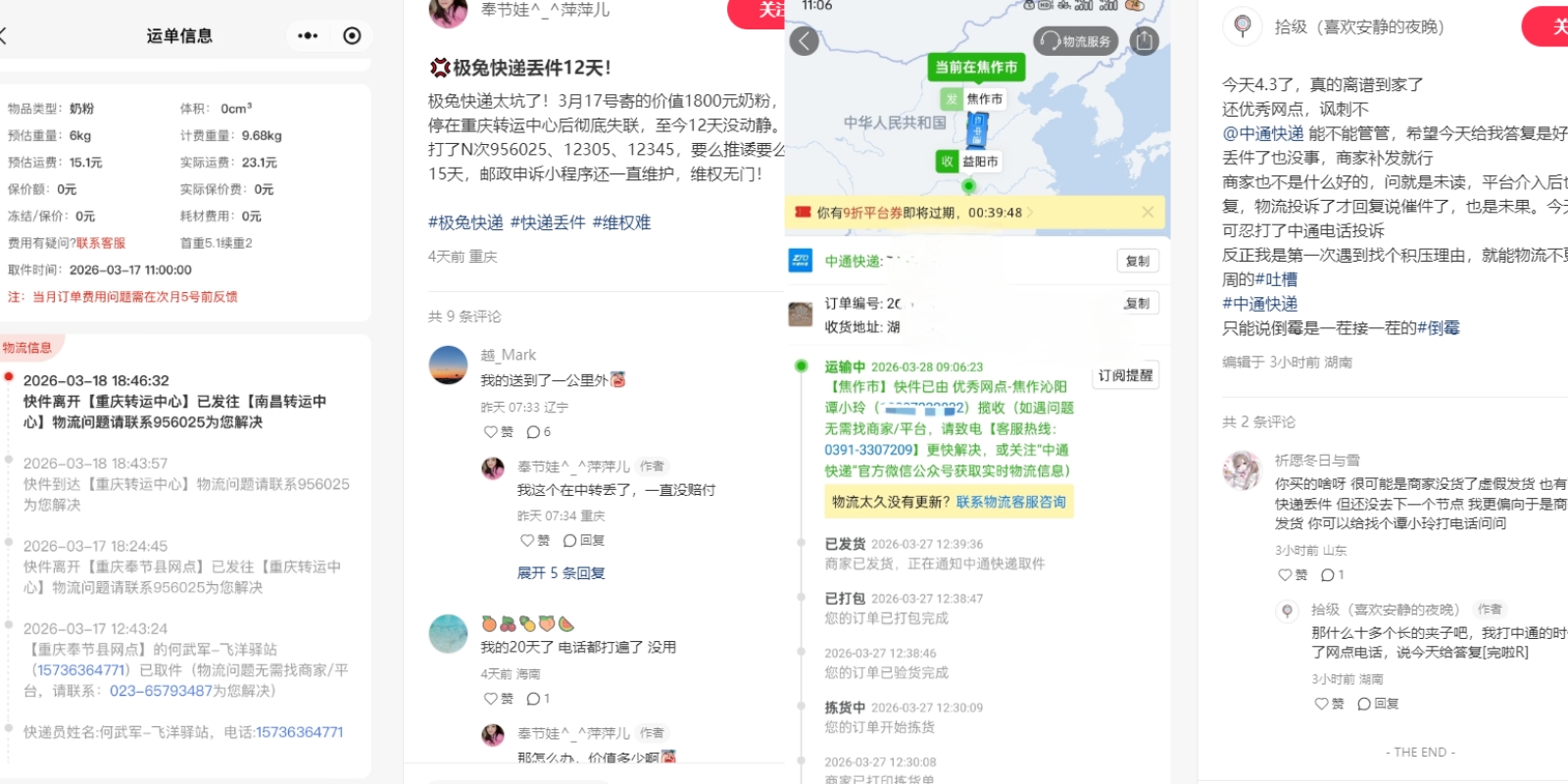 比如,“拾级(喜欢安静的夜晚)”反映,自己的中通快递已一周没有更新物流信息;而“奉节娃萍萍儿”的极兔快递,物流信息已停更12天,包裹至今下落不明。