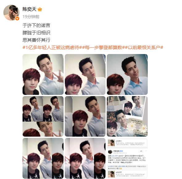 2025年初冬的微博页面上,陈奕天敲下带着温度的文字:"那些年许下的约定,像被晨露打湿的信笺;故人身影,是水墨画里晕开的留白。"九宫格中央,他与于朦胧相视而笑的合照泛着暖光,这帧被粉丝们日夜期盼的同框,终于化作初雪降临般的惊喜。