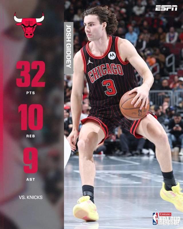 此外,凭借这场比赛,吉迪也成为公牛队史上第二位至少拿到两次20+三双的球员,而排在他前面的,仅有乔丹一人。