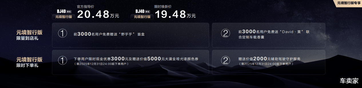 北京越野带来了元境智行版专享礼包:限量到店礼和限时下单礼。两项限量到店礼:前3000名用户,免费送“野乎乎”盲盒和北京越野与国际知名调香师David·黄联合定制的车载香囊。两项限时下单礼:第一项:从即刻起到年底下订用户,限时享现金优惠3000元;以及价值5000元的大漠金哑光漆颜色券。第二项:从即刻起到年底下定用户,限时赠送价值2000元的辅助驾驶守护服务。