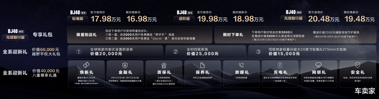 自此,BJ40增程家族一共拥有标准版、进阶版、元境智行版三个版型。北京越野还带来了BJ40增程三个版型均能享受的两大全系迎新礼。