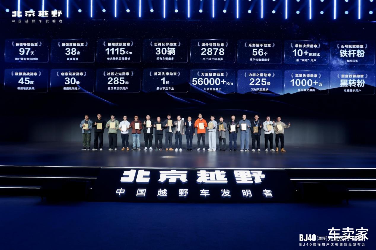 北汽集团董事长张建勇为BJ40增程“车主之最”用户颁奖。16位获奖用户包括等车时间最久用户、行驶里程最长用户、一箱油单次跑出最远里程用户等,他们用一个个动人的故事,让BJ40增程不仅仅是一台车,更成为一种文化,一种精神符号。