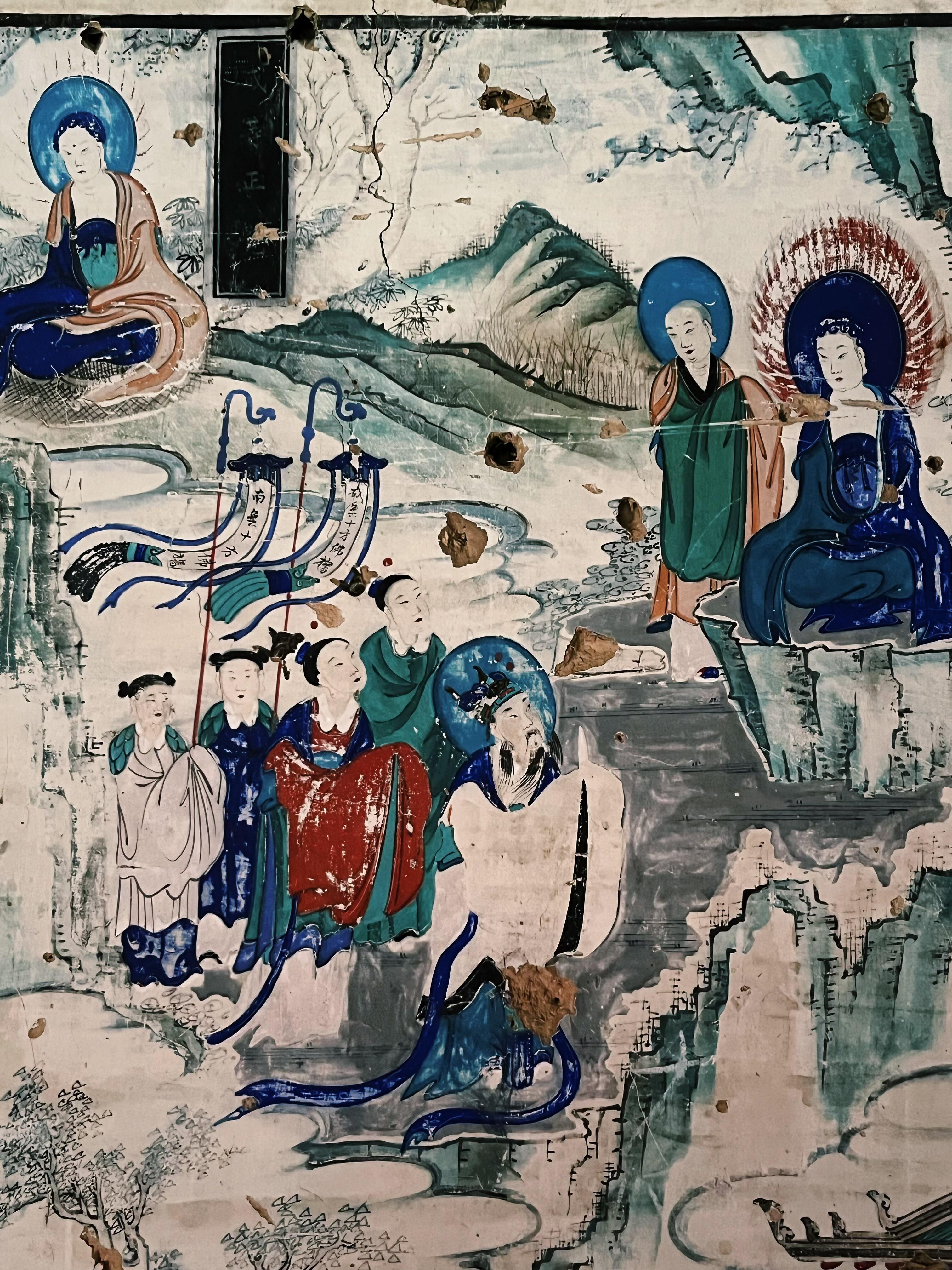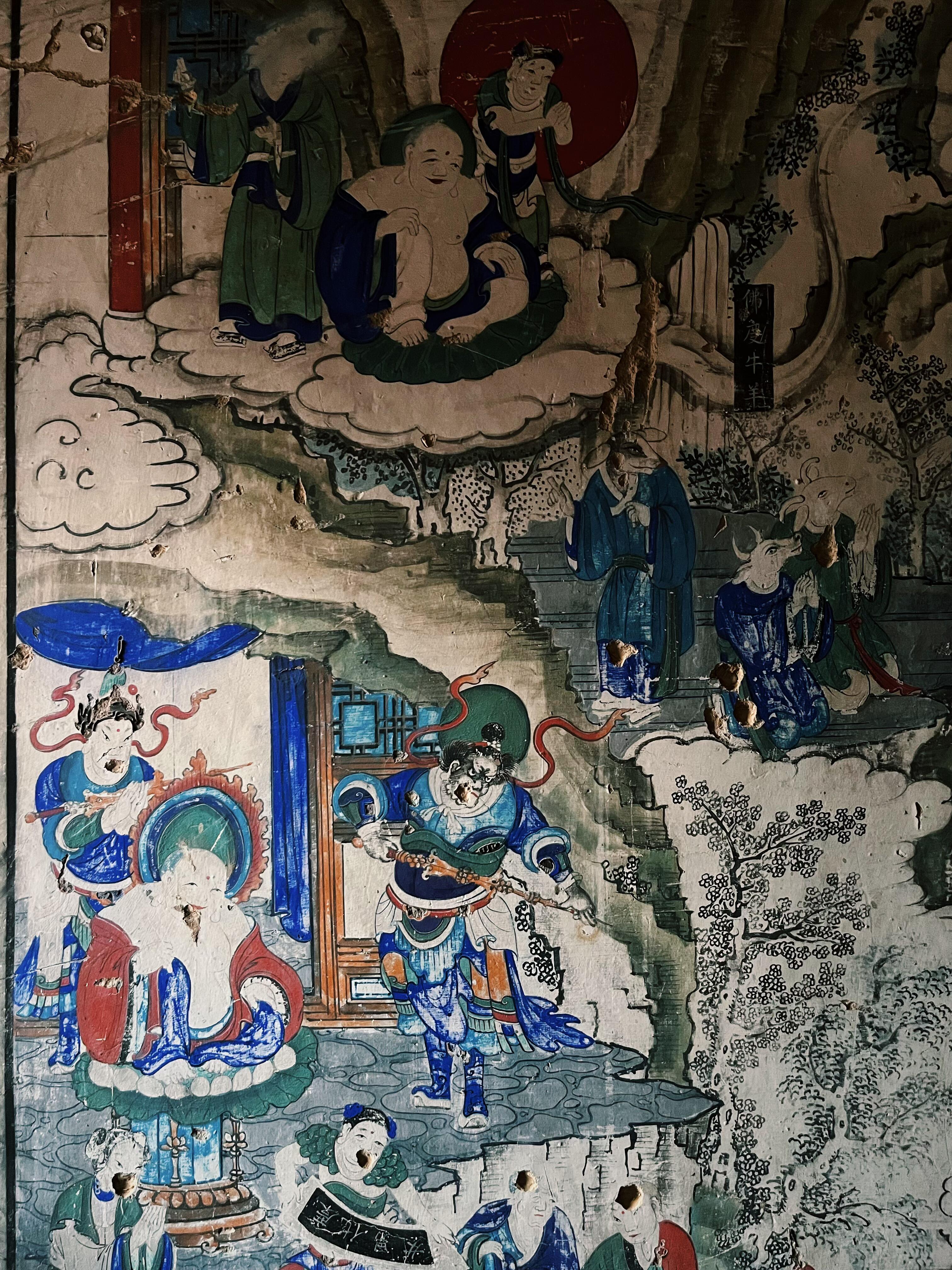 塔内的辽代壁画残片,为这种信仰提供了实物佐证。二层西南壁的"药师经变"中,描绘了一幅"燃灯供塔"的场景:数位比丘尼手持莲花灯,围绕砖塔诵经,塔前的供桌上摆放着粟米、羊头和皮囊酒,这些极具游牧特色的供品,揭示了辽代佛教的多元面貌。更值得关注的是,壁画中砖塔的形象与现存觉山寺塔完全一致,连塔刹的相轮数目都分毫不差,堪称最珍贵的"建筑自画像"。