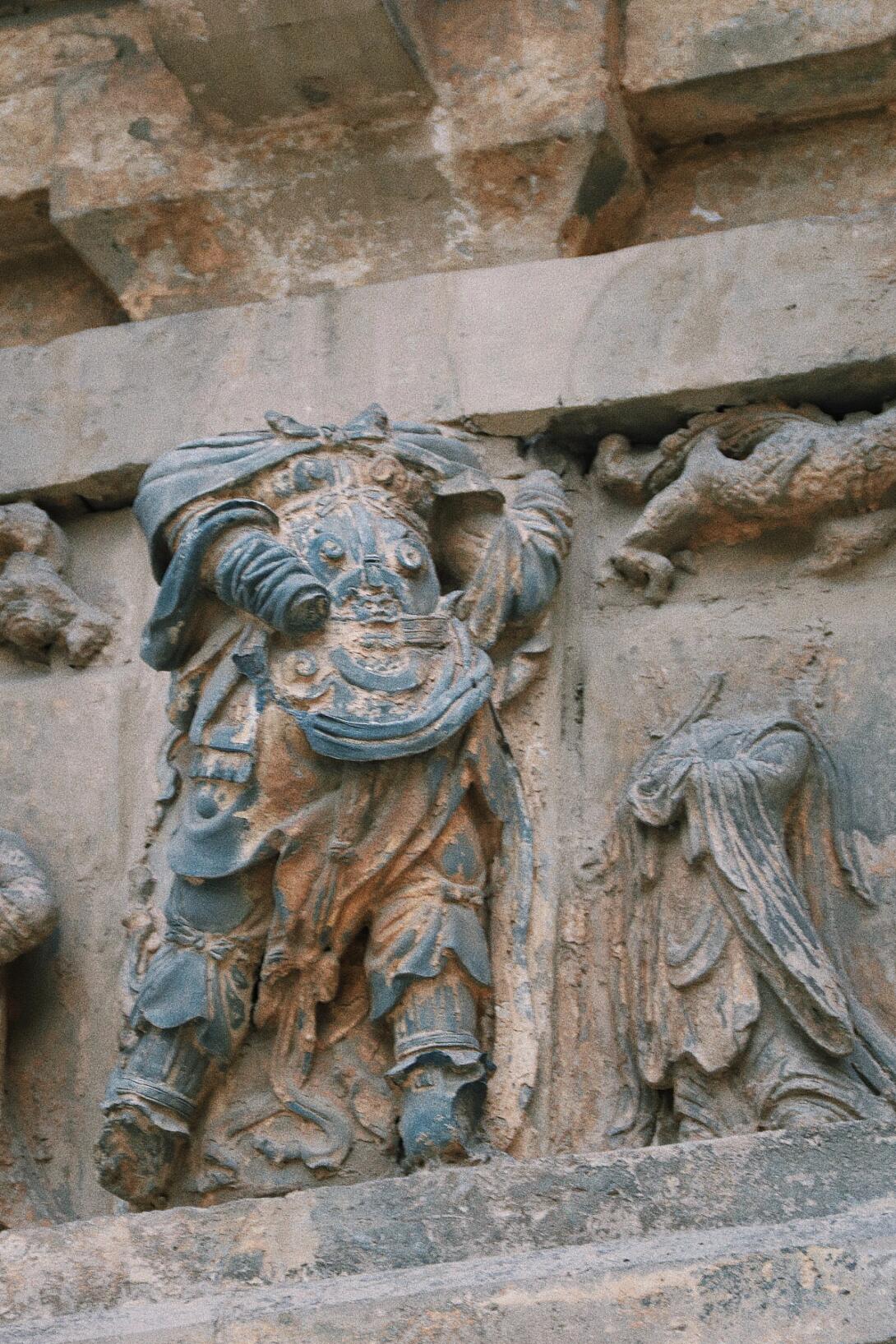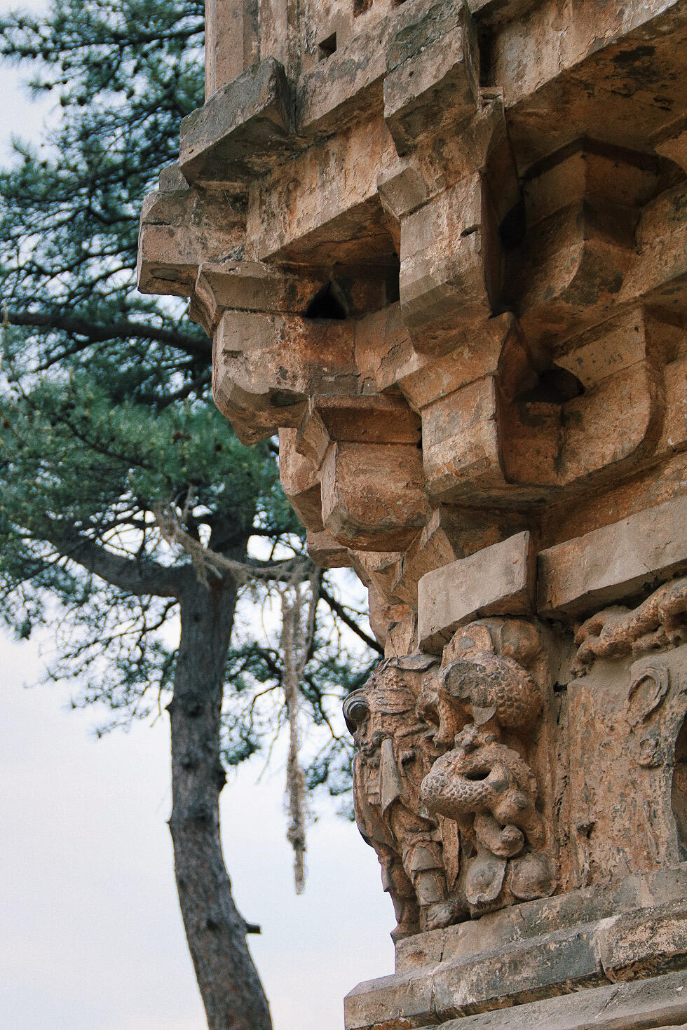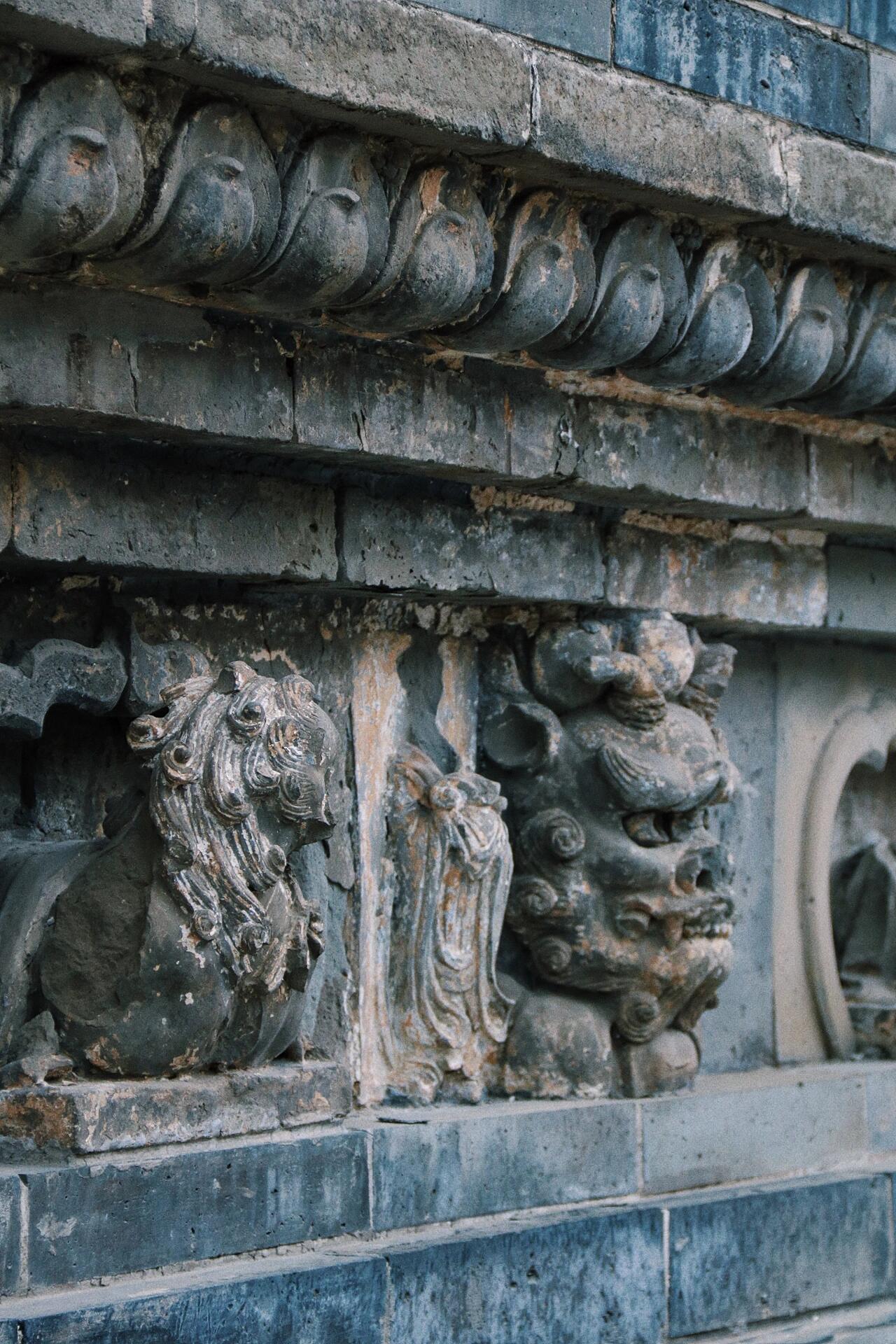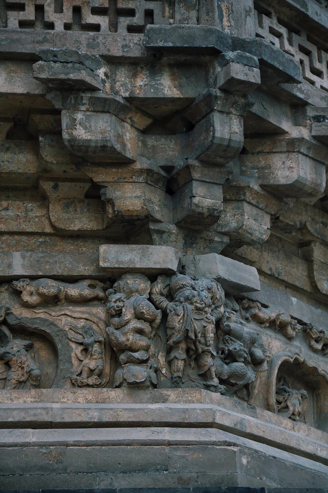 塔身的砖雕艺术堪称辽代民间工艺的缩影。正南券门两侧的金刚力士像,肌肉线条隆起如岩石,铠甲鳞片采用"减地平钑"技法,虽经雨水侵蚀,仍能看出甲片的叠压关系。值得注意的是,东侧砖雕的供养人穿着左衽长袍,腰间系着蹀躞带,这种典型的契丹服饰特征,与西侧汉服打扮的供养人形成鲜明对比,印证了辽代"因俗而治"的统治策略。塔内的藻井砖雕更令人称奇,八角形的井心内,八条砖雕游龙呈"翔鳞式"排列,龙爪握着火珠,这种"九龙攒珠"的构图,在现存辽代建筑中极为罕见。