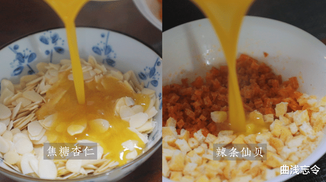 2、处理食材:①整型:把辣条、仙贝、大的坚果等较大的食材剪成大小合适的小颗粒。②烤坚果:如果有生的食材,比如生的坚果仁就先烤熟。