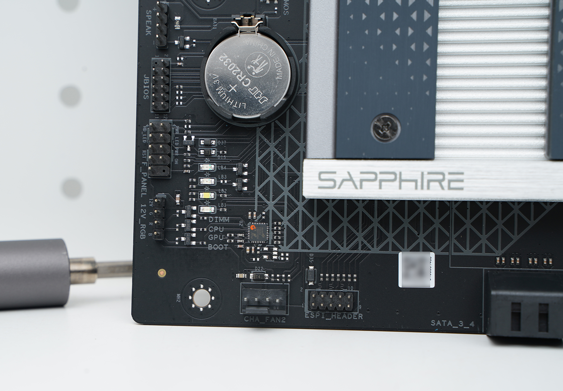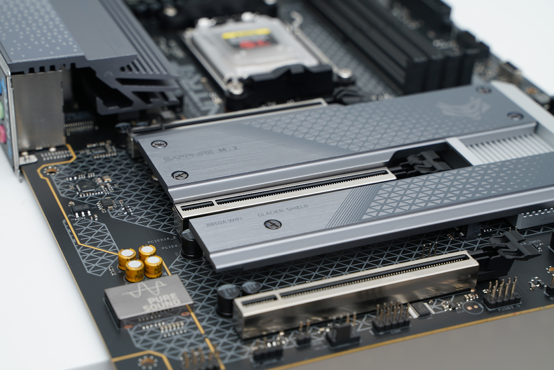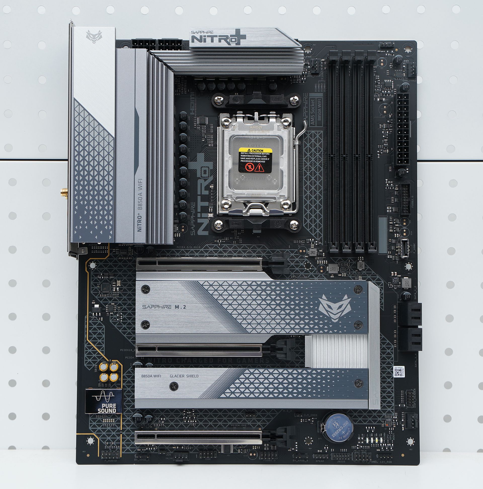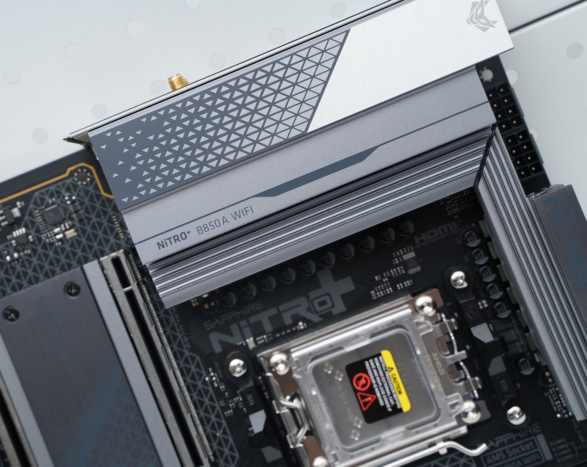 这款蓝宝石NITRO B850A WIFI主板整体走银灰与黑色的硬朗工业风,大面积金属散热装甲覆盖 CPU 供电区与 M.2 插槽,搭配几何图腾与拉丝工艺,延续了 NITRO+ 显卡一贯的科技质感。