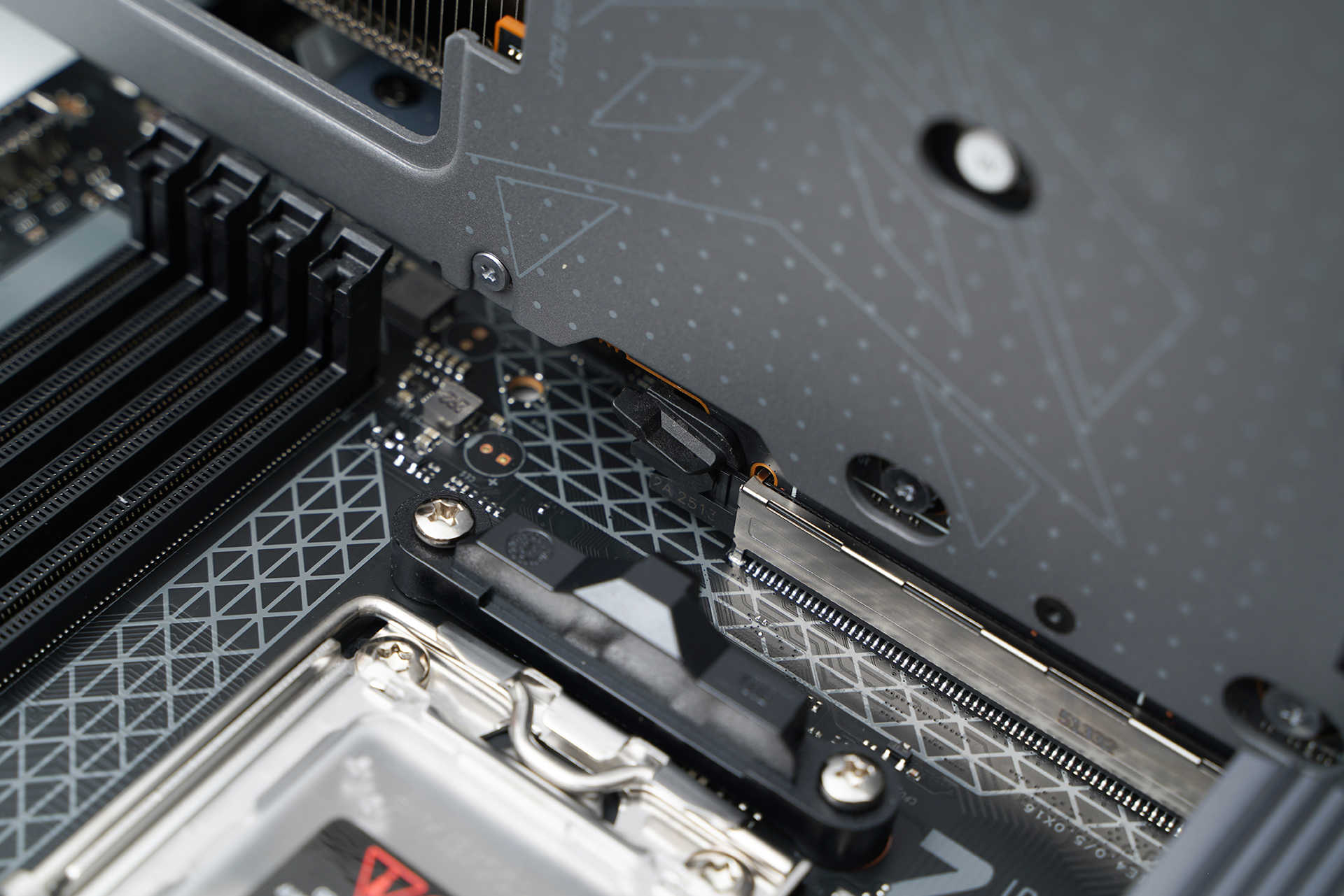 这款主板配备了三条全长显卡插槽,并且均采用金属加固设计,提升了承重与耐用性。首条插槽支持PCIe 5.0 ×16,带宽高达 64GB/s,可充分发挥新一代显卡的性能;第二条与第三条插槽分别对应 PCIe 4.0 ×4 和 PCIe 4.0 ×2 规格,满足多样化拓展需求。同时,插槽之间预留了充足间距,能够有效避免显卡或扩展卡在安装时发生干涉,兼顾性能与兼容性。