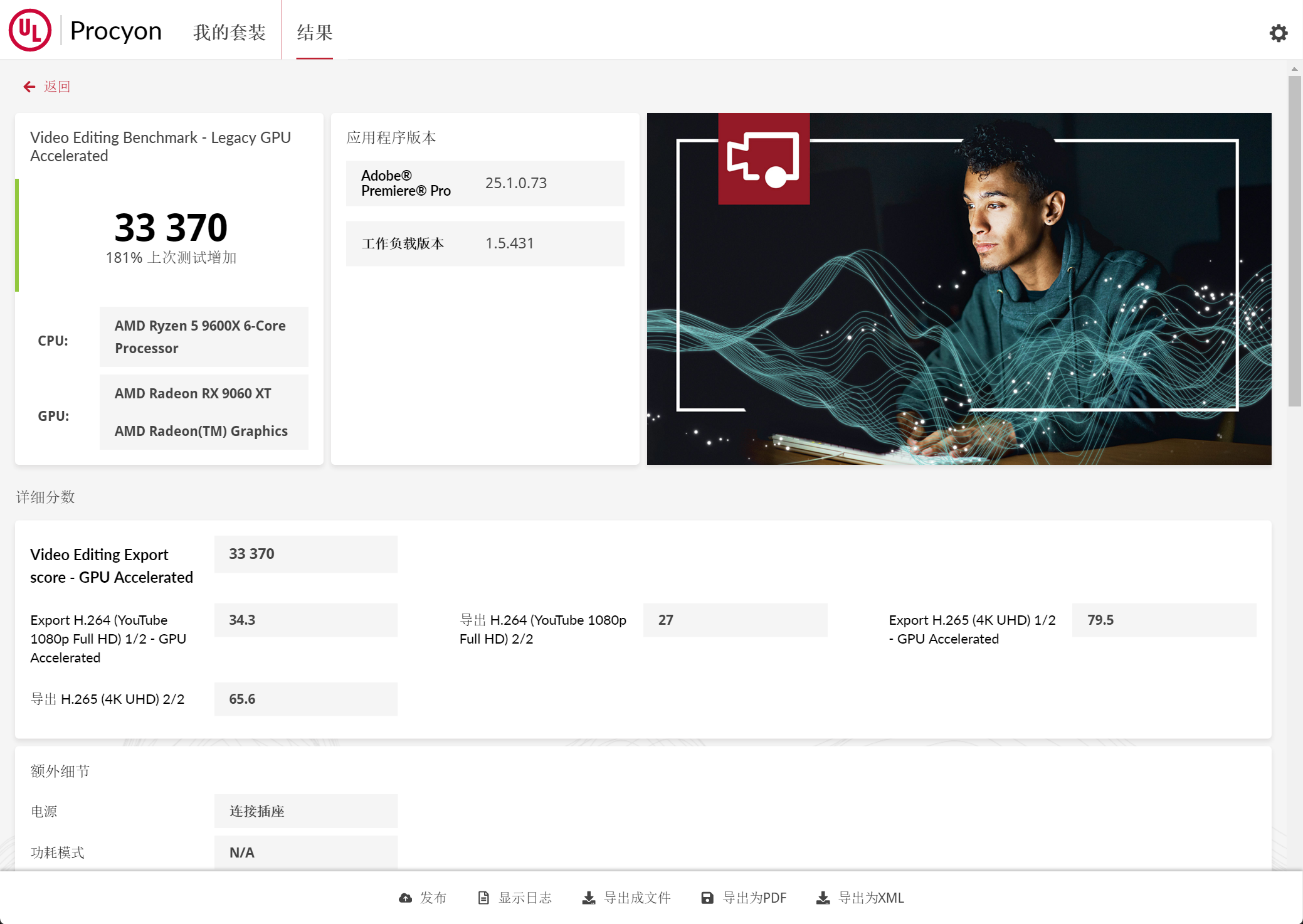 在UL Procyon的视频剪辑测试中,Ryzen5 9600X搭配Radeon RX 9060 XT分别取得了33370与33635的总分,整体差距约0.8%,性能表现基本一致。从细项来看,两次测试在H.264导出时分别耗时34.3秒与34.1秒,H.265 4K导出则是65.6秒对65秒,差距都在误差范围内。