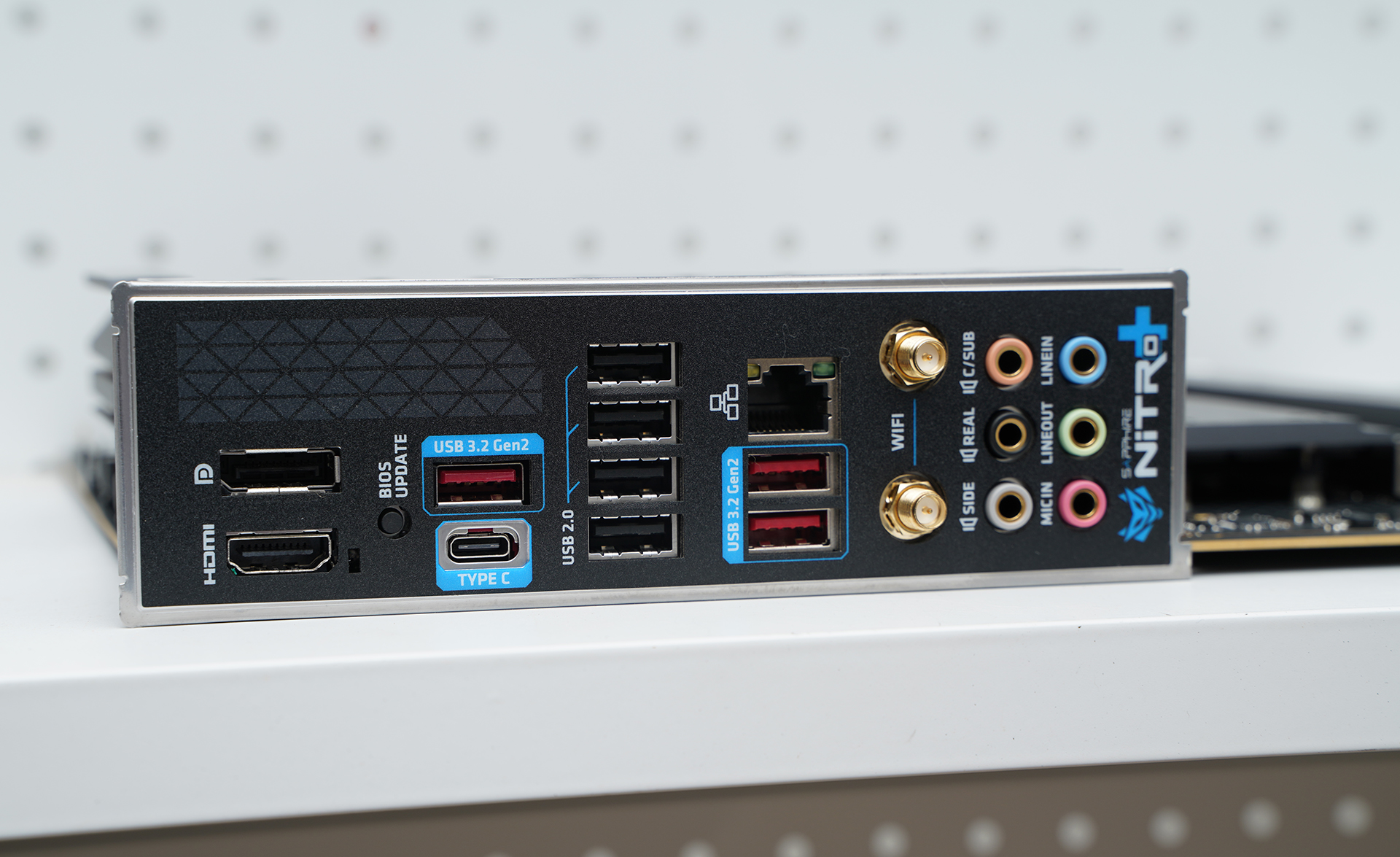后置 I/O 部分则提供了丰富的外设支持。视频输出方面,配备了DP与HDMI 各1 个,可满足核显处理器的直连显示需求;高速传输上,提供 1 个 10Gbps USB-C 和 3 个 10Gbps USB-A 接口,外加4个USB 2.0,无论是高速外设还是基础连接都能兼顾。同时板载6声道音频接口,可轻松连接音响、耳机或麦克风。网络部分主打2.5G有线网口,并支持 WiFi 6与蓝牙5.0,确保有线无线皆具备高速稳定的连接体验。左侧的小按钮是BIOS更新快捷键,能在无CPU状态下对主板BIOS进行更新。