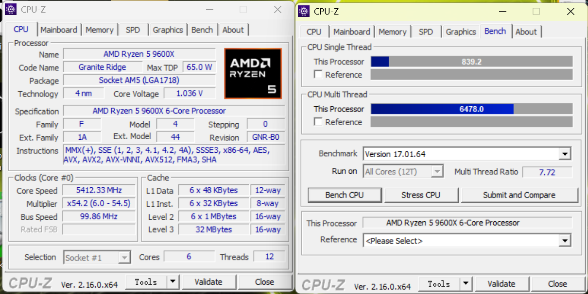 在相同5.4GHz核心频率下,Ryzen5 9600X在DDR5-6000MHz并保持UCLK=MCLK 1:1环境下,单核成绩为839.2,多核成绩为6478.0;而在DDR5-4800Mhz环境下,单核成绩提升至850.8,多核成绩为6464.1。整体来看,低频内存下单核略有优势(约+1.4%),但多核表现基本持平,说明内存频率对单线程延迟更敏感,而对多线程吞吐影响有限。