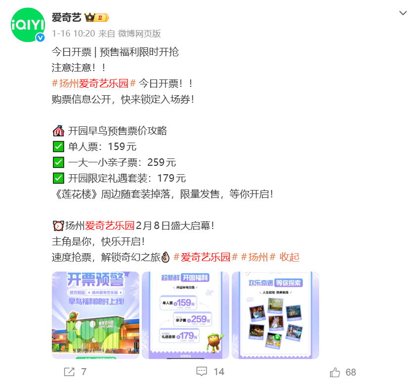 爱奇艺正尝试让IP版图从线上屏幕延伸至线下实体空间。2026年1月16日,爱奇艺首个线下乐园项目预售开票,并定于2月8日正式开园。这个位于江苏扬州的乐园,以国创IP加前沿科技为核心定位,设计了包含全感剧场、光影互动空间在内的体验版块,呈现了《唐朝诡事录》《狂飙》《苍兰诀》《莲花楼》等头部剧集的现实场景,试图将用户在观看内容时产生的情感连接,转化为可触摸、可参与的实体体验。
