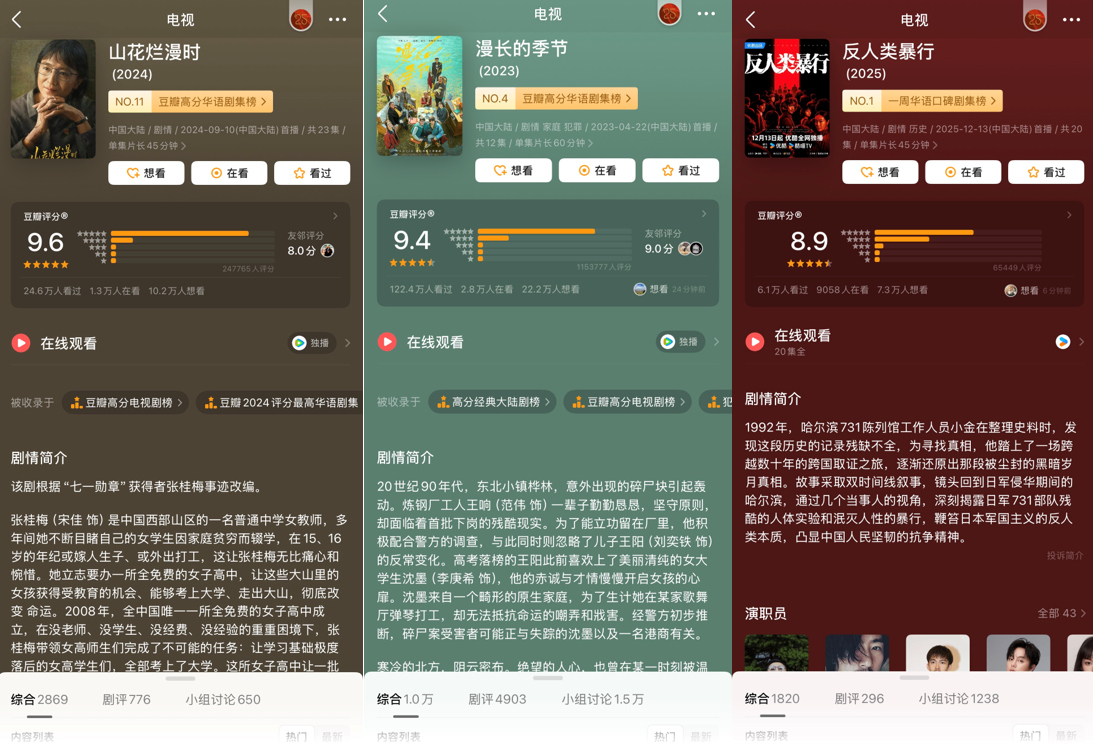更重要的是,2025年的流量与口碑更为割裂。《山花烂漫时》评分人数超过24万,豆瓣评分9.4的2024年头部剧集《漫长的季节》评分人数为115万,但《反人类暴行》的评分人数目前仅6.5万。