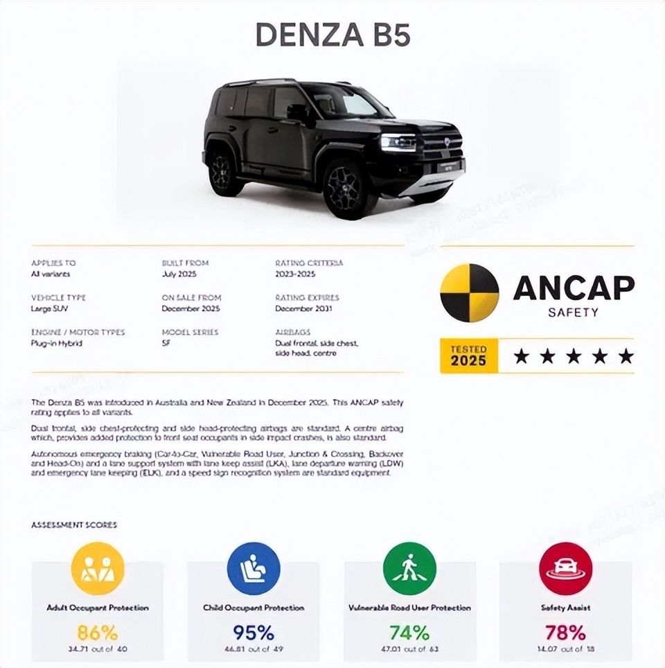 别看被扣了分,豹5最终还是拿下了ANCAP五星安全评级,四大核心项目全都是顶尖水平。尤其是儿童保护项目,得分率高达95%,排在ANCAP历年测试车型前列,成人保护、行人保护和安全辅助项目,成绩也格外亮眼,硬核实力没得说。