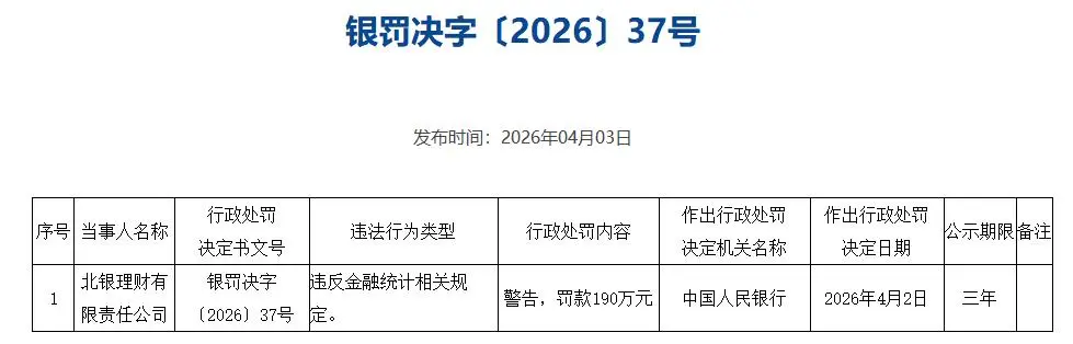4月3日,中国人民银行公示的行政处罚信息显示,北银理财因违反金融统计相关规定,被中国人民银行予以警告,并处以190万元罚款。据同花顺iFinD信息统计,这是银行理财子公司2026年以来收到的首张罚单,也是北银理财成立以来收到的首张监管罚单。
