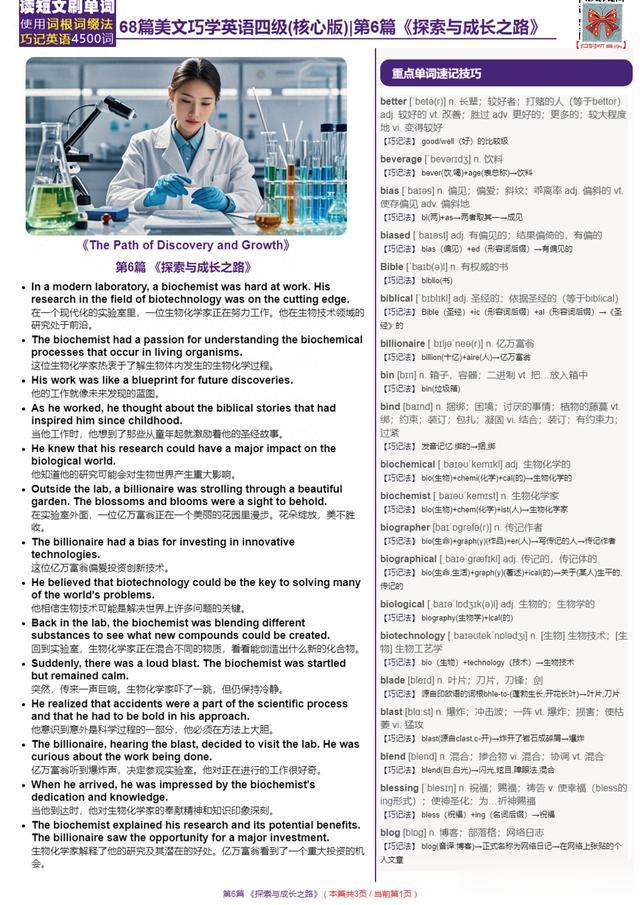 《The Path of Discovery and Growth》第6篇 《探索与成长之路》In a modern laboratory, a biochemist was hard at work. His research in the field of biotechnology was on the cutting edge. (在一个现代化的实验室里,一位生物化学家正在努力工作。他在生物技术领域的研究处于前沿。)[语法]:前半句 “In a modern laboratory” 是地点状语,“a biochemist” 是主语,“was hard at work” 是过去进行时结构,描述当时生物化学家正在努力工作的状态;后半句 “His research” 是主语,“in the field of biotechnology” 是后置定语修饰 “research”,“was on the cutting edge” 是系表结构,说明其研究处于前沿,整体先体现当时的工作状态,再描述研究的情况,分别用过去进行时和一般过去时。(过去进行时、一般过去时)The biochemist had a passion for understanding the biochemical processes that occur in living organisms. (这位生物化学家热衷于了解生物体内发生的生物化学过程。)[语法]:“The biochemist” 是主语,“had” 是谓语动词,“a passion for understanding the biochemical processes that occur in living organisms” 是宾语(其中 “for understanding...” 是介词短语作后置定语修饰 “passion”,“that occur in living organisms” 是定语从句修饰 “processes”),描述过去生物化学家的情况。(一般过去时)His work was like a blueprint for future discoveries. (他的工作就像未来发现的蓝图。)[语法]:“His work” 是主语,“was like” 是系表结构(“like” 在此处是介词),“a blueprint for future discoveries” 是表语,把他的工作比作未来发现的蓝图,描述过去其工作的特点。(一般过去时)As he worked, he thought about the biblical stories that had inspired him since childhood. (当他工作时,他想到了那些从童年起就激励着他的圣经故事。)[语法]:“As he worked” 是时间状语从句,“he” 是主语,“thought about” 是谓语动词,“the biblical stories that had inspired him since childhood” 是宾语(其中 “that had inspired him since childhood” 是定语从句修饰 “stories”),描述过去他工作时思考的内容。(一般过去时)He knew that his research could have a major impact on the biological world. (他知道他的研究可能会对生物世界产生重大影响。)[语法]:“He” 是主语,“knew” 是谓语动词,“that his research could have a major impact on the biological world” 是宾语从句,在宾语从句中 “his research” 是主语,“could have” 是谓语结构,“a major impact” 是宾语,“on the biological world” 是状语,描述过去他知道的关于其研究影响的情况。(一般过去时)Outside the lab, a billionaire was strolling through a beautiful garden. The blossoms and blooms were a sight to behold. (在实验室外面,一位亿万富翁正在一个美丽的花园里漫步。花朵绽放,美不胜收。)[语法]:包含两个句子,前半句 “Outside the lab” 是地点状语,“a billionaire” 是主语,“was strolling through” 是过去进行时结构,描述当时亿万富翁正在花园散步的状态;后半句 “The blossoms and blooms” 是主语,“were” 是系动词,“a sight to behold” 是表语,说明花朵的景象,先体现当时的行为,再描述景象情况,分别用过去进行时和一般过去时。(过去进行时、一般过去时)The billionaire had a bias for investing in innovative technologies. (这位亿万富翁偏爱投资创新技术。)[语法]:“The billionaire” 是主语,“had” 是谓语动词,“a bias for investing in innovative technologies” 是宾语(其中 “for investing in innovative technologies” 是介词短语作后置定语修饰 “bias”),描述过去亿万富翁的偏好情况。(一般过去时)He believed that biotechnology could be the key to solving many of the world's problems. (他相信生物技术可能是解决世界上许多问题的关键。)[语法]:“He” 是主语,“believed” 是谓语动词,“that biotechnology could be the key to solving many of the world's problems” 是宾语从句,在宾语从句中 “biotechnology” 是主语,“could be” 是谓语结构,“the key” 是表语,“to solving many of the world's problems” 是介词短语作后置定语修饰 “key”,描述过去他的信念内容。(一般过去时)Back in the lab, the biochemist was blending different substances to see what new compounds could be created. (回到实验室,生物化学家正在混合不同的物质,看看能创造出什么新的化合物。)[语法]:“Back in the lab” 是地点状语,“the biochemist” 是主语,“was blending” 是过去进行时结构,体现当时正在进行的动作,“different substances” 是宾语,“to see what new compounds could be created” 是不定式短语作目的状语,描述当时生物化学家做实验的目的。(过去进行时)Suddenly, there was a loud blast. The biochemist was startled but remained calm. (突然,传来一声巨响。生物化学家吓了一跳,但仍保持冷静。)[语法]:包含两个句子,前半句 “Suddenly” 是副词作状语,“there was” 是存在句的一般过去时结构,“a loud blast” 是主语;后半句 “The biochemist” 是主语,“was startled” 是系表结构,“remained calm” 是并列的谓语短语,先描述突然出现的情况,再描述生物化学家当时的反应,分别用一般过去时和过去进行时。(一般过去时、过去进行时)He realized that accidents were a part of the scientific process and that he had to be bold in his approach. (他意识到意外是科学过程的一部分,他必须在方法上大胆。)[语法]:“He” 是主语,“realized” 是谓语动词,“that accidents were a part of the scientific process” 和 “that he had to be bold in his approach” 是并列的宾语从句,描述过去他意识到的内容。(一般