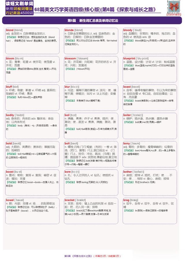 今天连载安安老师原创课程《68篇短文搞定大学四级英语核心词》第6讲。今天分享的篇名《The Path of Discovery and Growth》(第6篇 《探索与成长之路》)。本节课分享第6讲的视频专栏、短文中英文对照、逐句语法分析、以及本节课中包含的核心单词的巧记法。下面我们通过本篇短文串讲大学英语四级核心词。