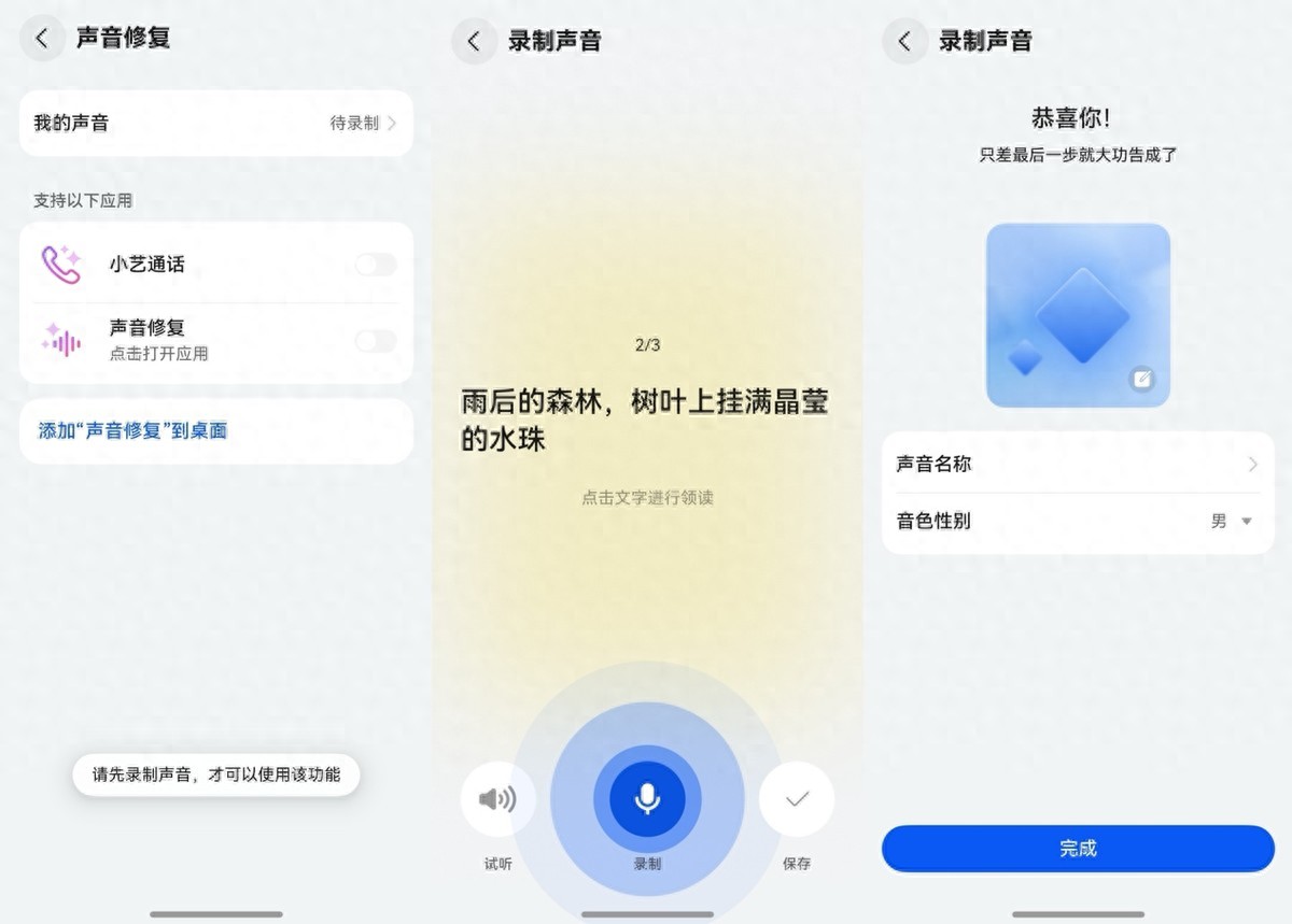 我首先试了试声音修复功能。先跟随引导录制好声音样本,无论是日常交流或打电话时,都能开启声音修复功能。实际用下来,最明显的感受是,小艺确实能将有些模糊的语句优化得更清晰,不仅能让语音内容更容易听清,而且优化后的音色也贴近本人原本的声音。