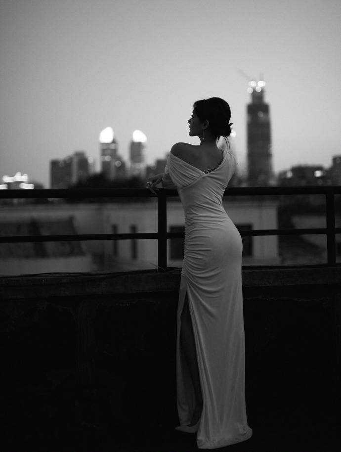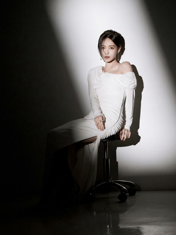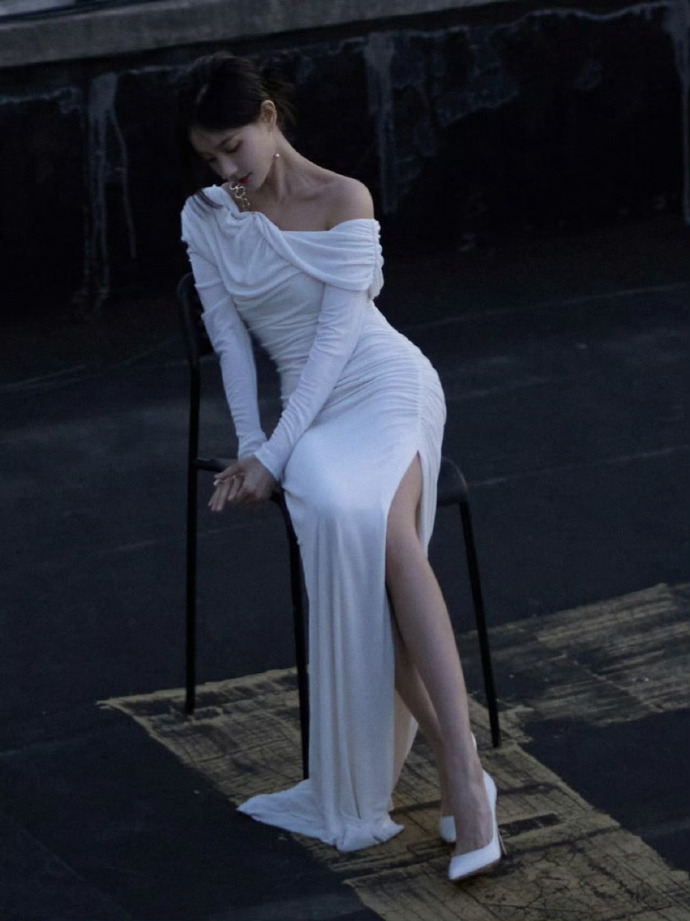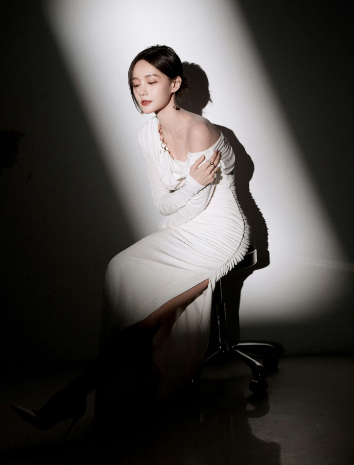 这套大片的妙处,是 “冷而不锐、柔而不腻”:白裙是底,褶皱是韵,而她的松弛是魂。往镜头前一站,就把 “都市夜色里的柔美人像” 焊成了独一份的风景,原来高级感从不是用力,是她抬眸间漫出来的轻熟底气。
