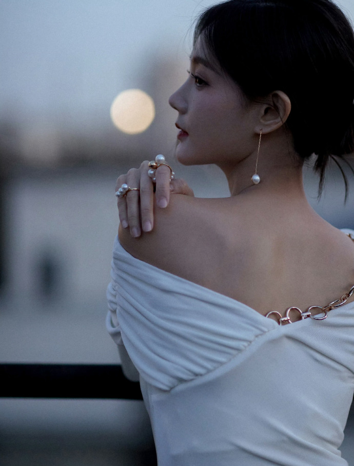 她或倚着栏杆垂眸,或坐在椅上抬眼,碎发垂在颈侧,连指尖轻搭肩线的弧度都恰好。暗调背景里,裙身的白像揉碎的月光,而她的神态是松弛的 —— 没有刻意凹出的清冷,是风吹动碎发的自然,是珍珠耳坠轻晃的柔,让白裙不再是单调的素净,成了裹着鲜活气的氛围感载体。